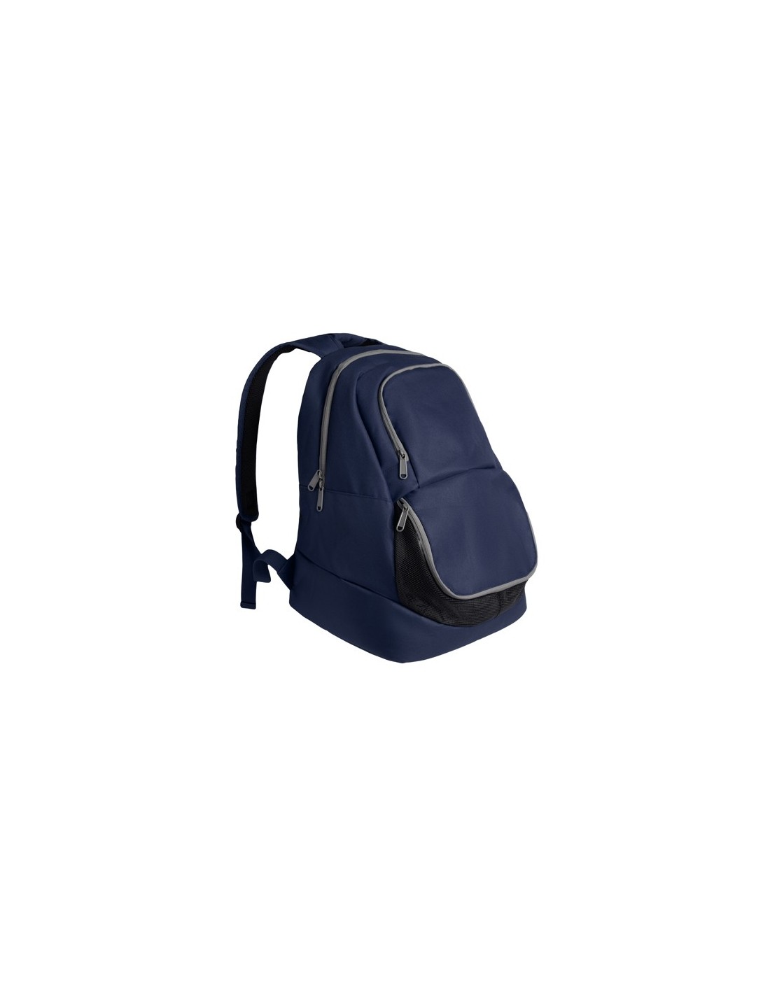 Mochila deportiva con diseño ergonómico y de fácil personalización. Doble asa reforzada para hombros y asa especial de mano. Respaldo acolchado. Bolsillo zapatillero de acceso frontal. Un bolsillo principal con doble tirador y un bolsillo frontal exterior de menor capacidad. Cremalleras a contraste en color gris. Detalles en color negro.