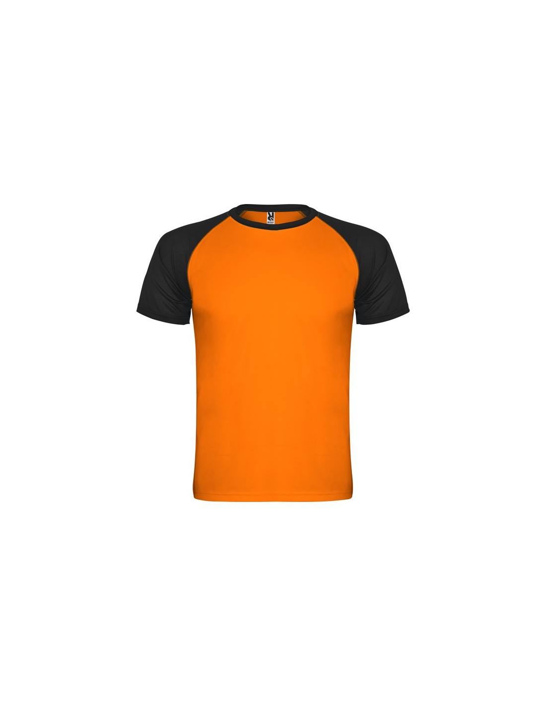 Camiseta deportiva de manga corta estilo ranglan en contraste. Cuello redondo en contraste con cubrecosturas de refuerzo.