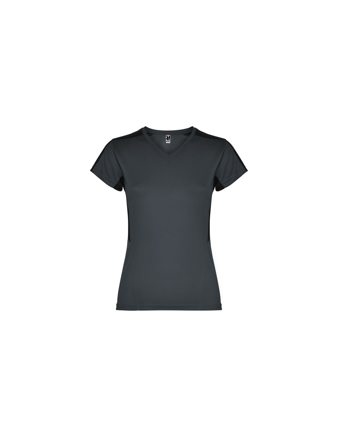 Camiseta técnica de manga corta para mujer con cuello pico. Combinada en laterales y hombros con dos tejidos de poliéster. Tejido principal bird´s eye y tejido rejilla 3D transpirable en hombros y paneles laterales. Tejido preparado para la absorción de humedad.