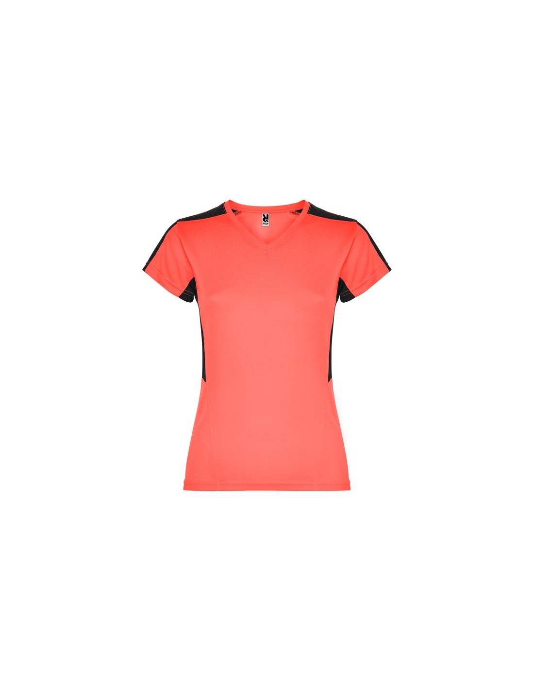 Camiseta técnica de manga corta para mujer con cuello pico. Combinada en laterales y hombros con dos tejidos de poliéster. Tejido principal bird´s eye y tejido rejilla 3D transpirable en hombros y paneles laterales. Tejido preparado para la absorción de humedad.