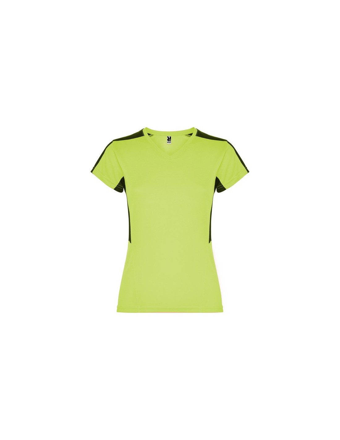 Camiseta técnica de manga corta para mujer con cuello pico. Combinada en laterales y hombros con dos tejidos de poliéster. Tejido principal bird´s eye y tejido rejilla 3D transpirable en hombros y paneles laterales. Tejido preparado para la absorción de humedad.