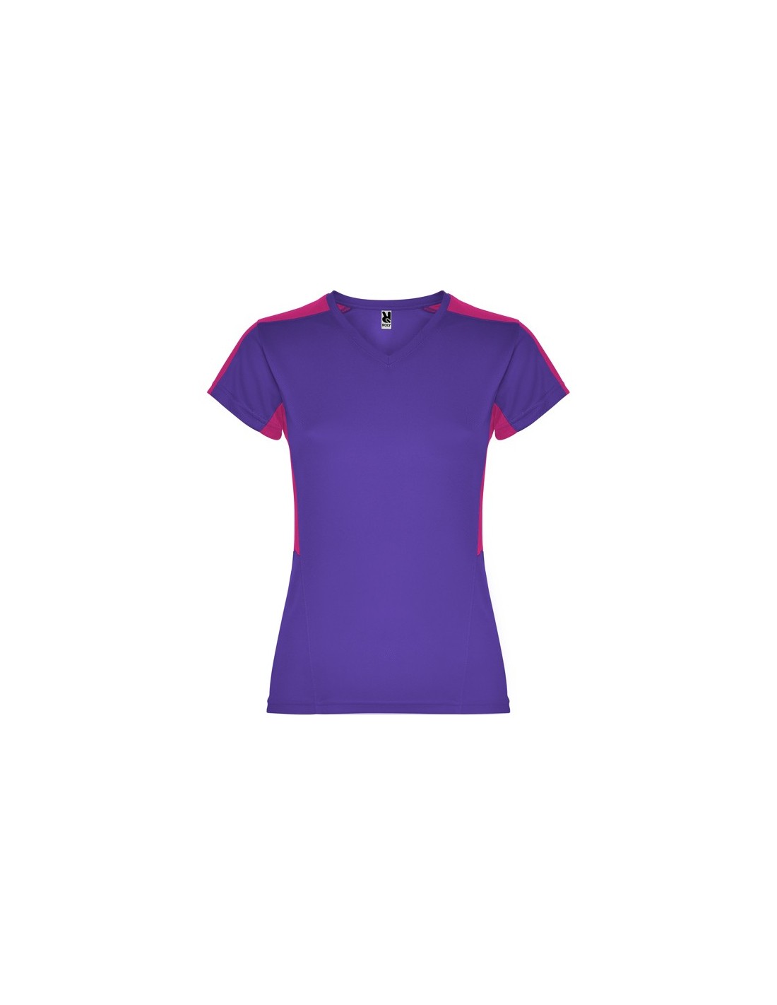 Camiseta técnica de manga corta para mujer con cuello pico. Combinada en laterales y hombros con dos tejidos de poliéster. Tejido principal bird´s eye y tejido rejilla 3D transpirable en hombros y paneles laterales. Tejido preparado para la absorción de humedad.