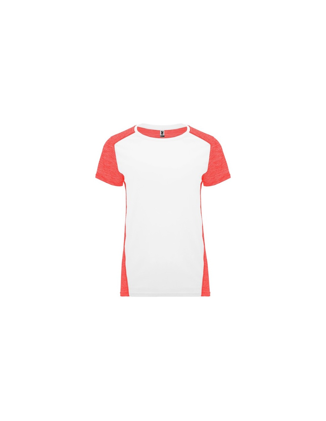 Camiseta técnica de manga corta para mujer, con cuello redondo. Combinado en espalda, hombros y mangas con dos tejidos de poliéster. Tejido principal frontal bird´s eye y tejido space dye en la parte trasera. Patronaje en la espalda ligeramente mas largo.