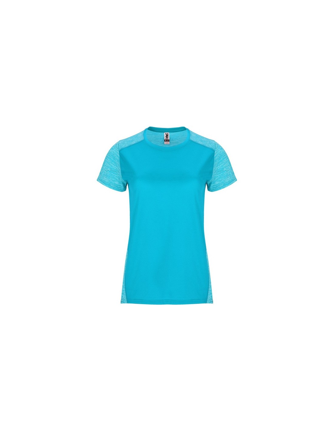 Camiseta técnica de manga corta para mujer, con cuello redondo. Combinado en espalda, hombros y mangas con dos tejidos de poliéster. Tejido principal frontal bird´s eye y tejido space dye en la parte trasera. Patronaje en la espalda ligeramente mas largo.