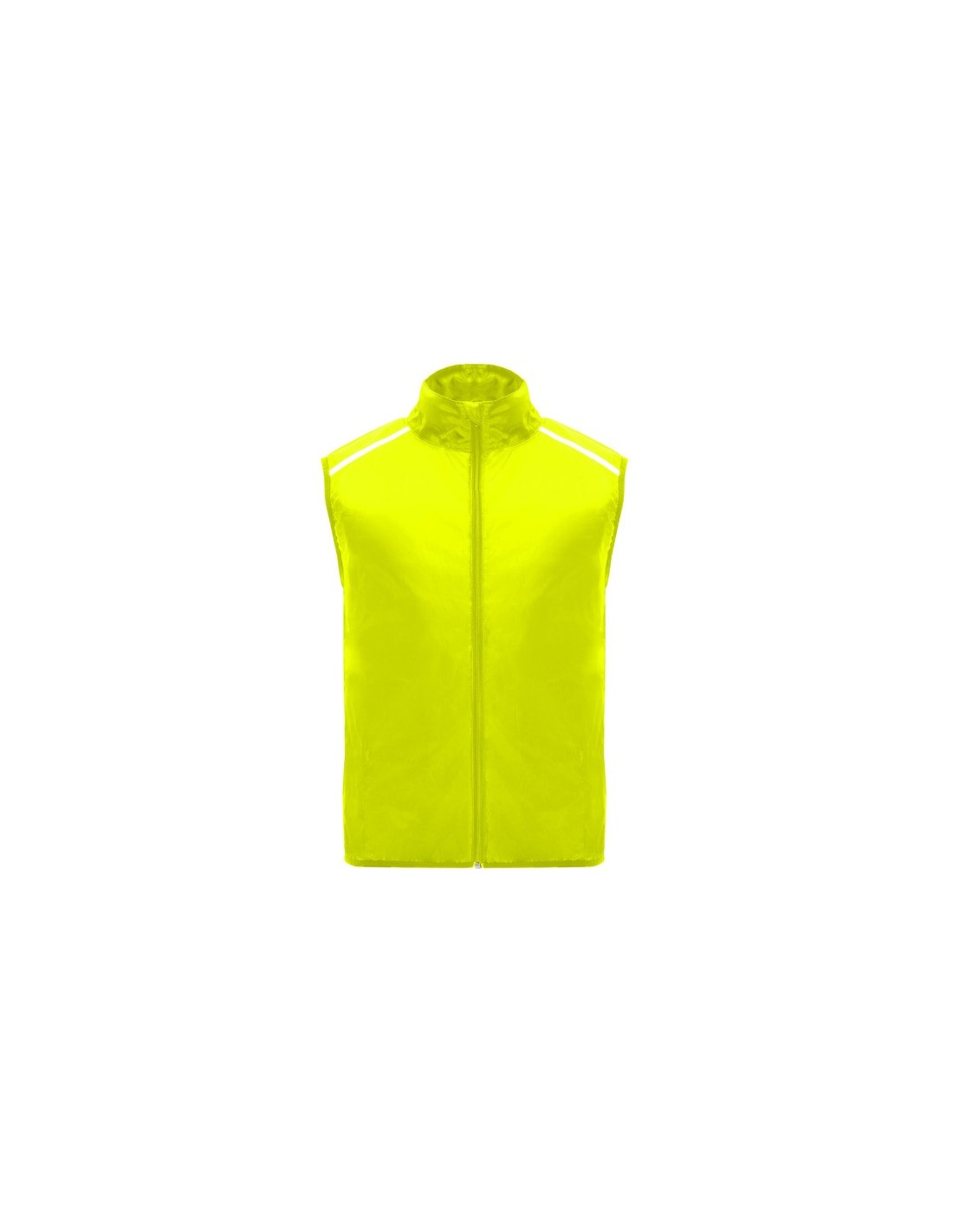 Chaleco técnico ligero de running, con cremallera frontal a tono con protector de barbilla. Ribete elástico en sisa y bajo. Parte inferior de la espalda en tejido micro perforado. Detalles reflectantes en la parte superior, delantera y trasera. Bolsillo con elástico para guardar el chaleco y llevarlo en la muñeca.