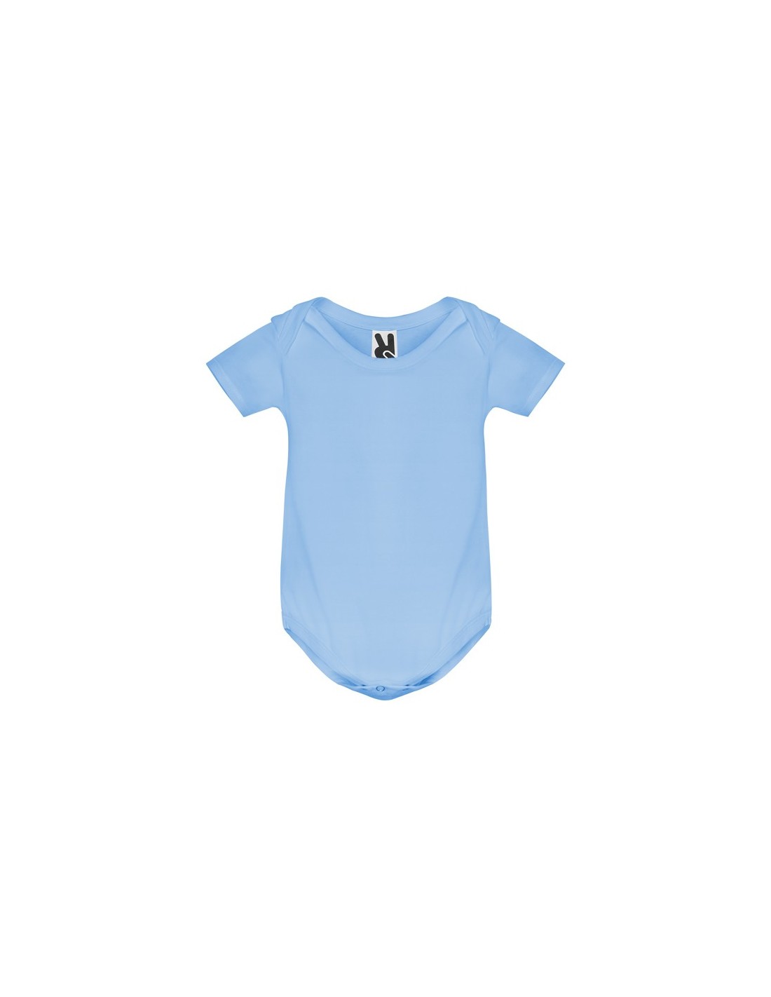 Body de bebé con manga corta de punto liso. Cuello redondo y bajo ribeteado en canalé 1x1. Cierre con botones a presión en la entrepierna. Hombro de apertura cruzada.
