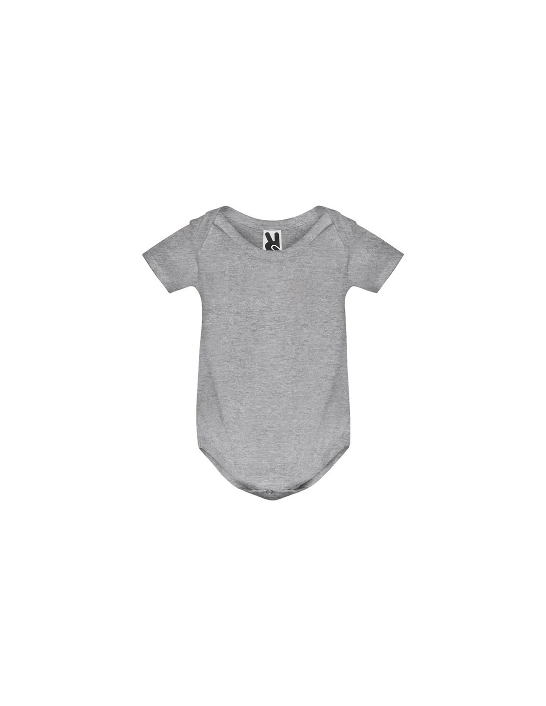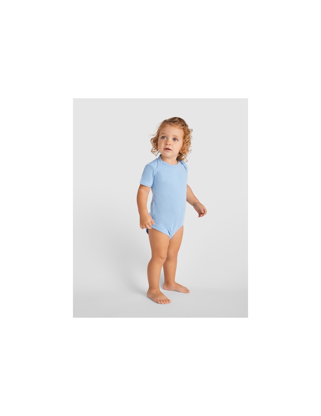 Body de bebé con manga corta de punto liso. Cuello redondo y bajo ribeteado en canalé 1x1. Cierre con botones a presión en la entrepierna. Hombro de apertura cruzada.