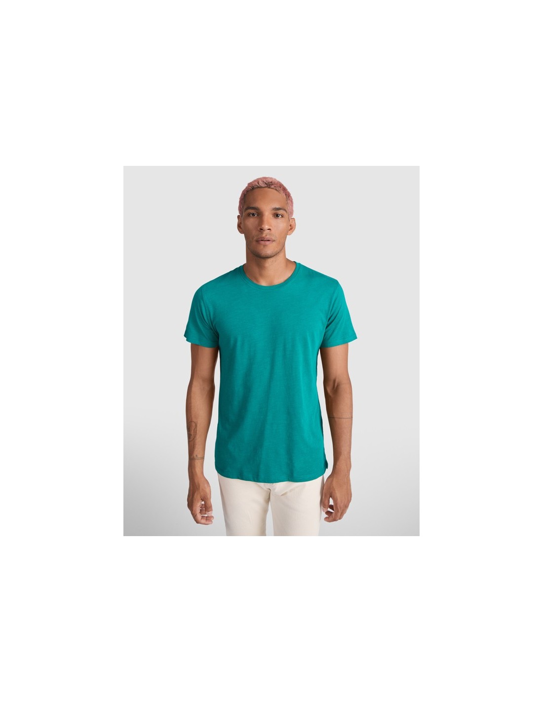 Camiseta de manga corta, en tejido vigoré inclinado. Cuello redondo del mismo tejido. Cubrecosturas interior a contraste de hombro a hombro. Costuras laterales remalladas de adorno. Bajo con aperturas laterales y el patronaje de la espalda es ligeramente más largo que el delantero.