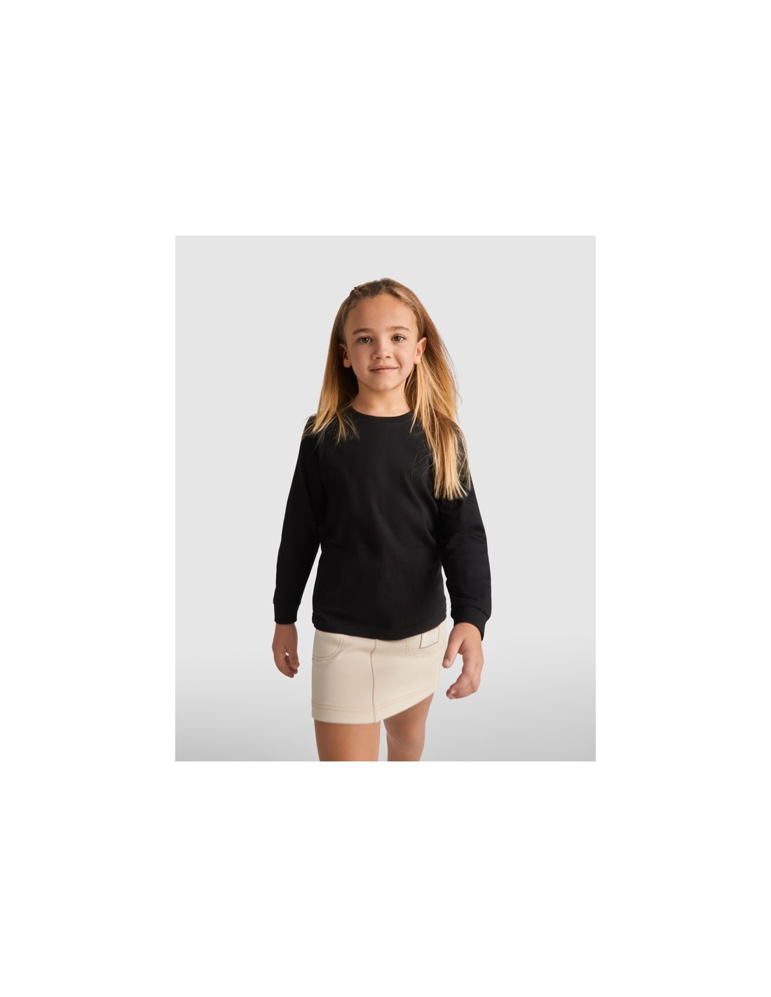 Camiseta de manga larga, tejido tubular y cuello redondo de 4 capas. Cubrecosturas de refuerzo en cuello y hombro. Sin puños.