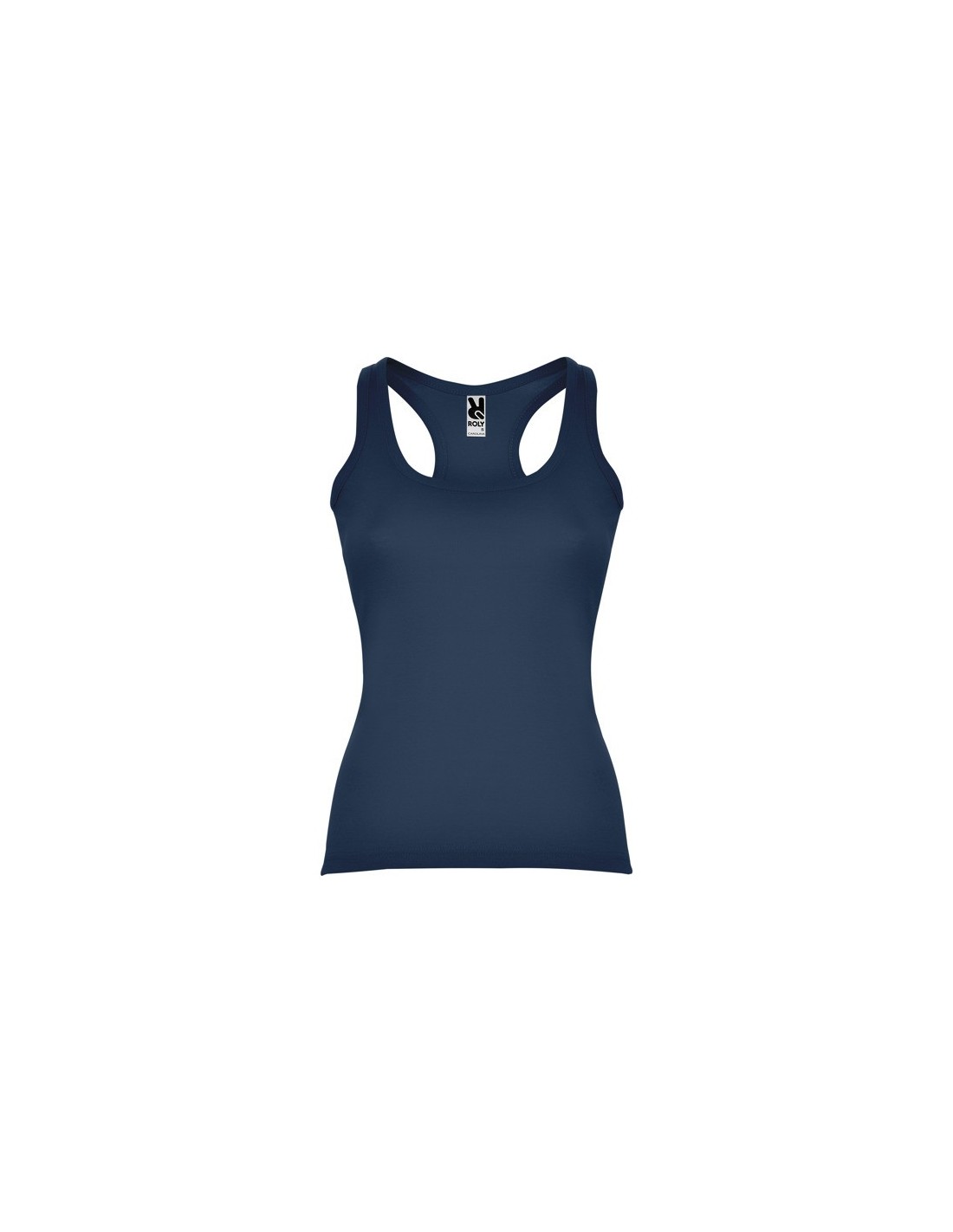 Camiseta entallada, con sisas y escote ribeteado, ancho y enrollado. Espalda estilo nadadora y costuras laterales.