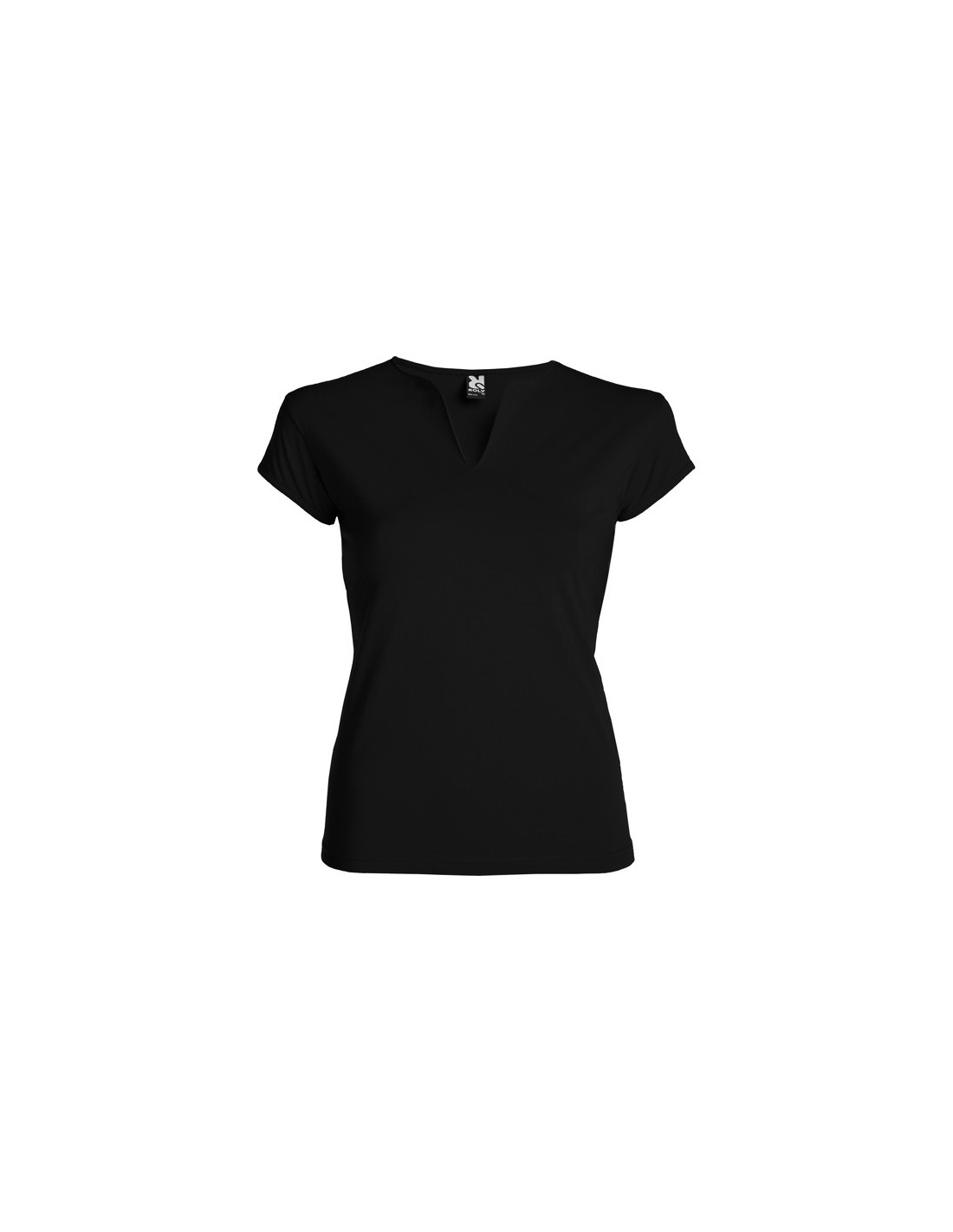 Camiseta entallada de cuello redondo con abertura en V, semi-manga al hombro ribeteada y costuras laterales.