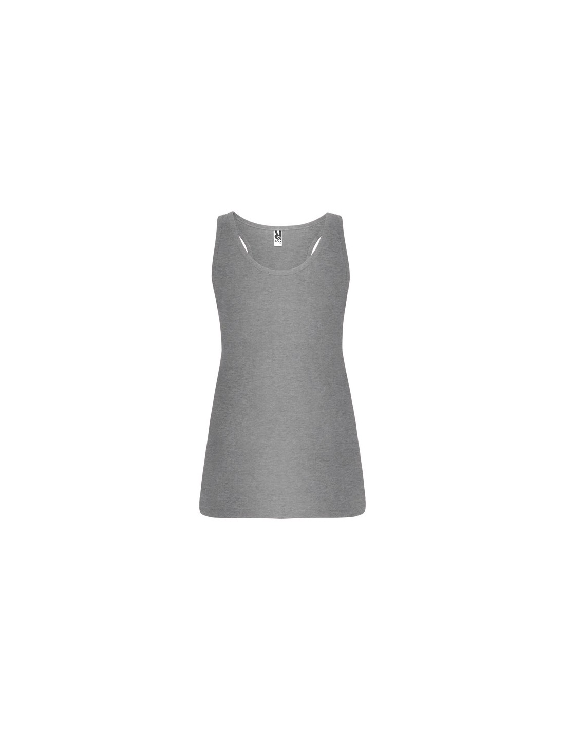 Camiseta entallada, con sisas y escote ribeteado, ancho y enrollado. Espalda estilo nadadora y costuras laterales.