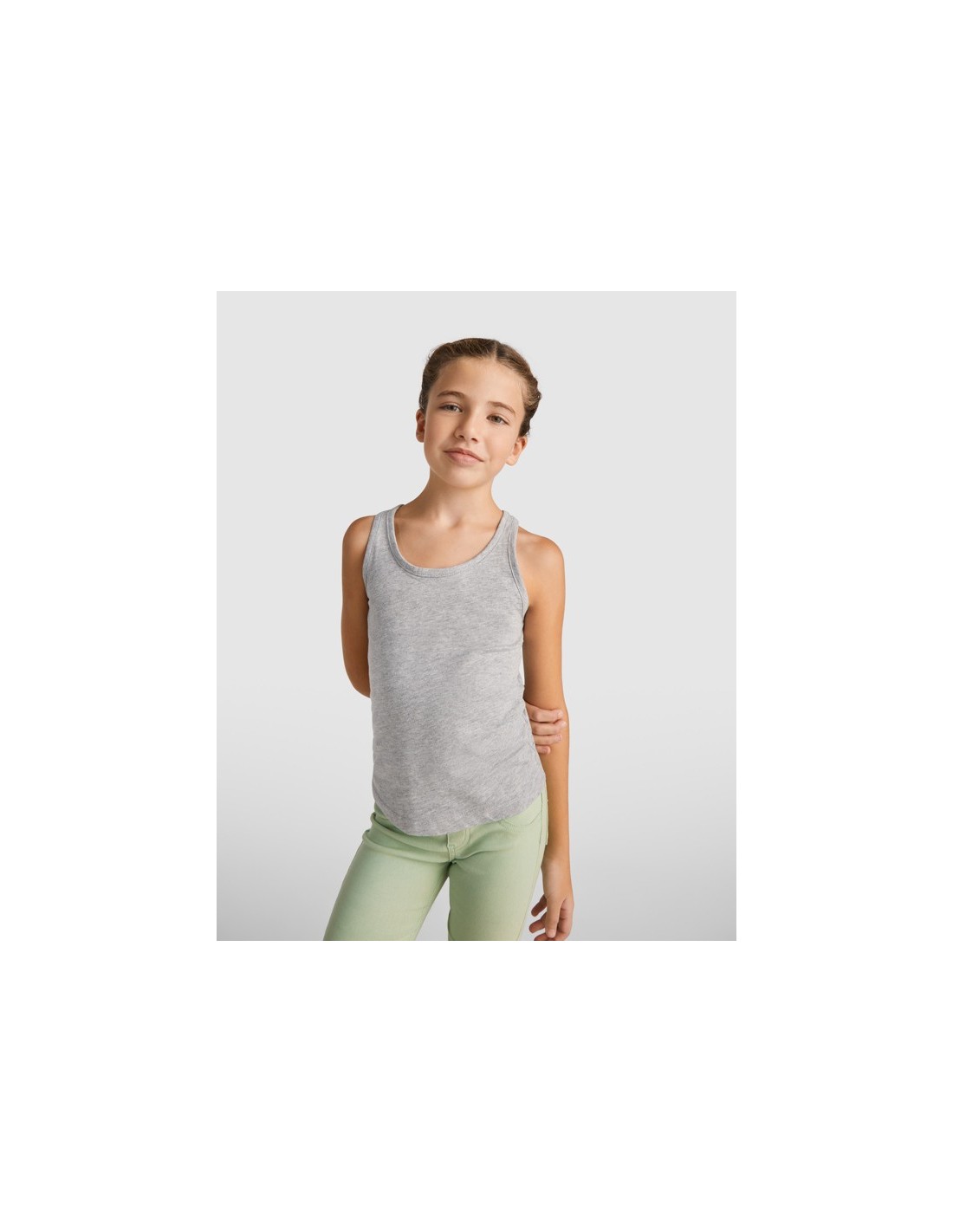 Camiseta entallada, con sisas y escote ribeteado, ancho y enrollado. Espalda estilo nadadora y costuras laterales.