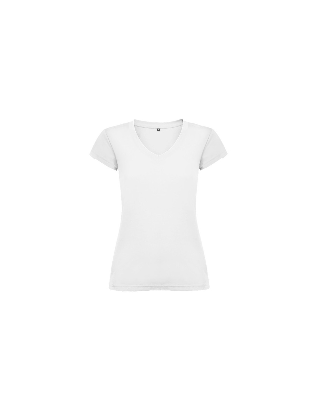 Camiseta de mujer con manga corta, escote en cuello de pico y acabados en ribete acanalado. Corte entallado con costuras laterales.