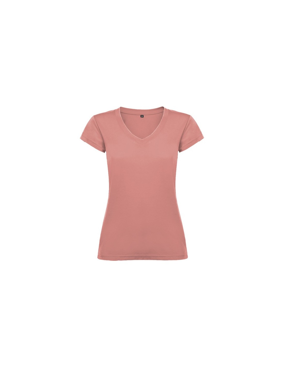Camiseta de mujer con manga corta, escote en cuello de pico y acabados en ribete acanalado. Corte entallado con costuras laterales.