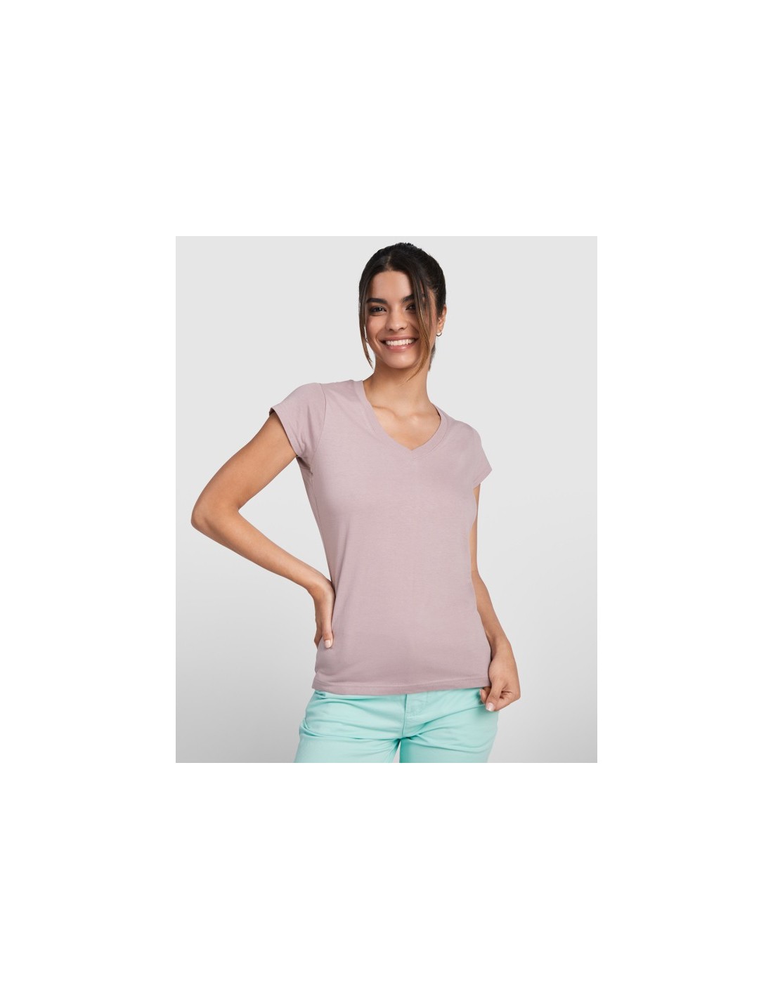 Camiseta de mujer con manga corta, escote en cuello de pico y acabados en ribete acanalado. Corte entallado con costuras laterales.