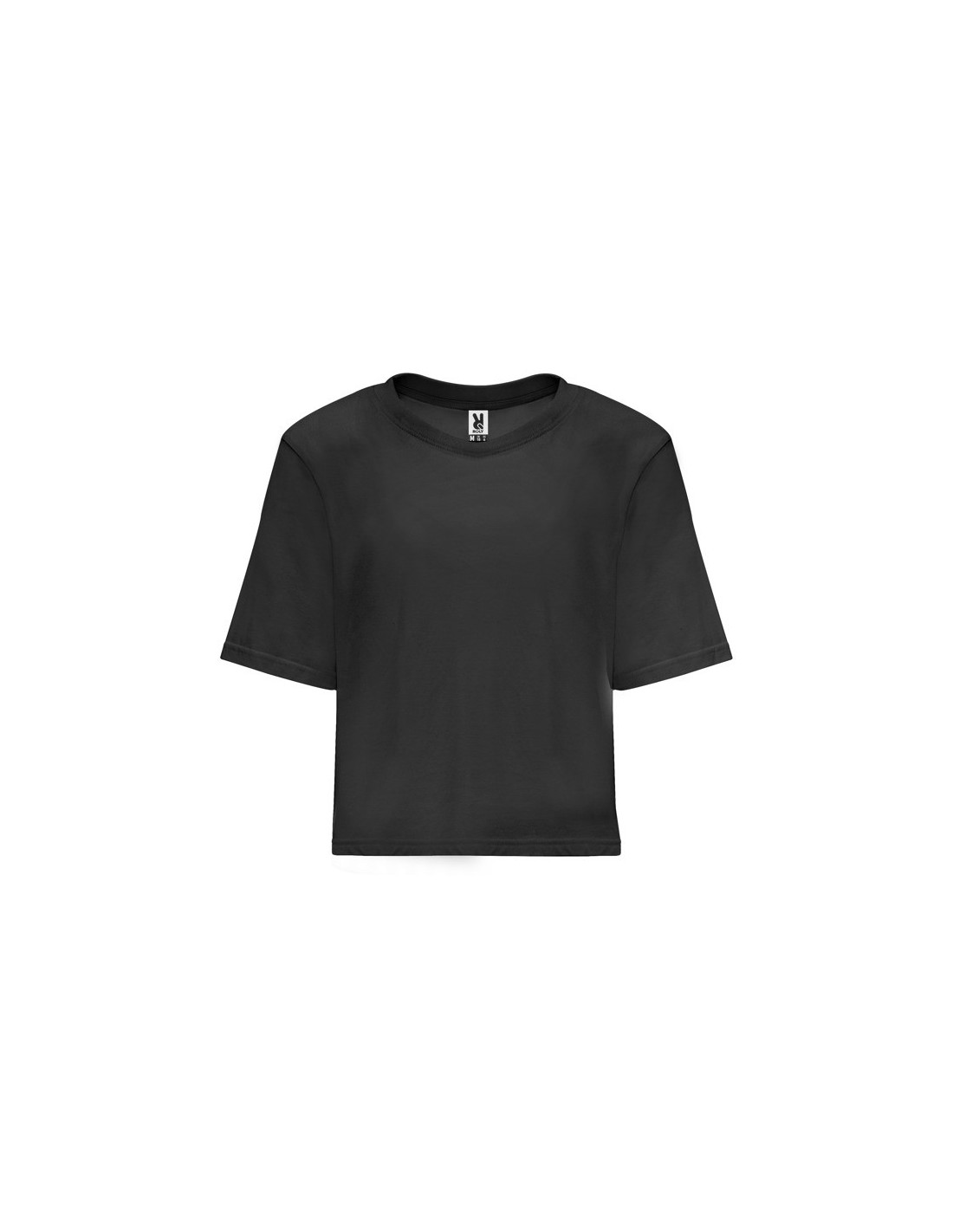 Camiseta de talle corto y holgado para mujer con manga corta. Cuello redondo con ribete ancho en canalé 1x1. Cubrecosturas reforzado a tono.