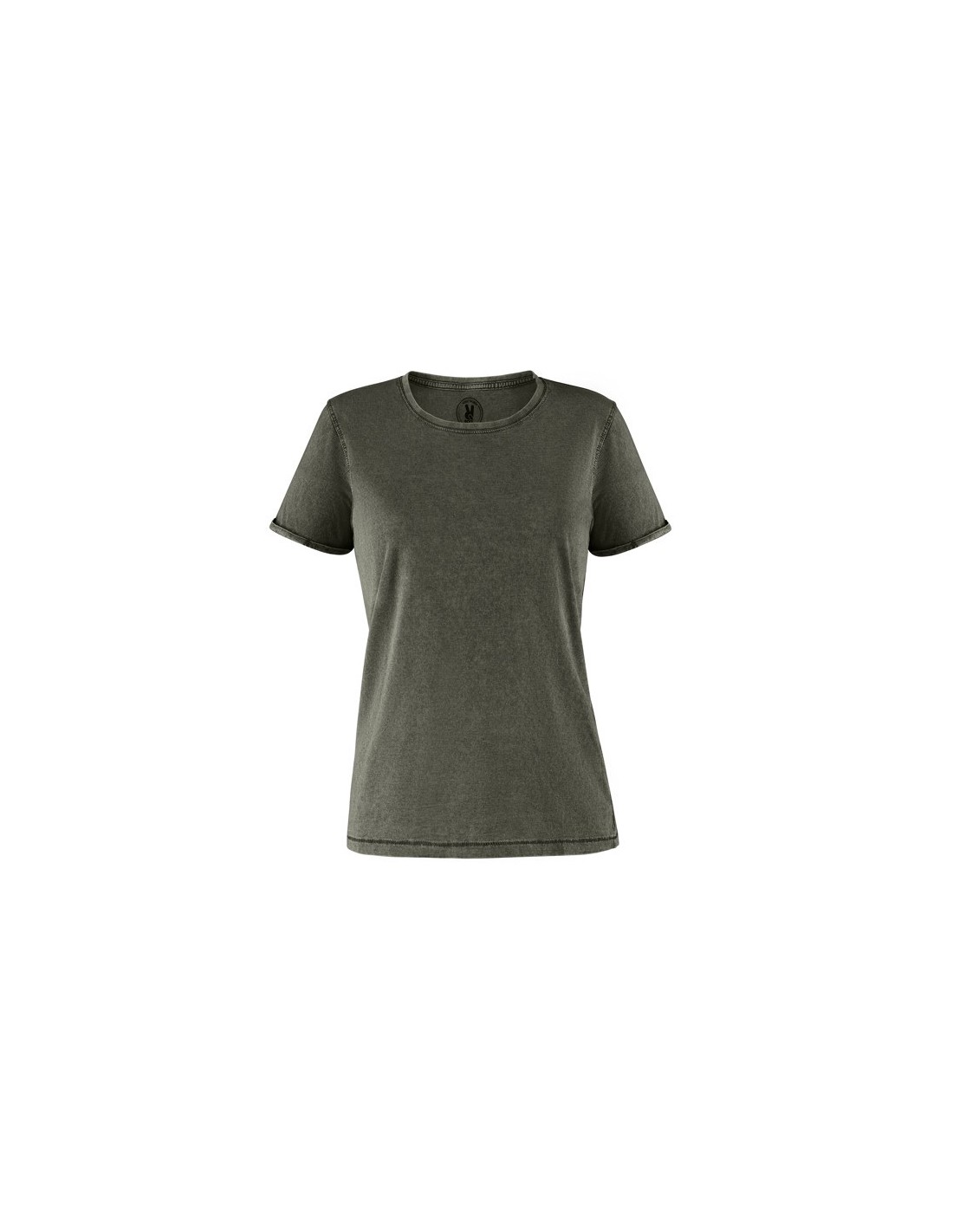 Camiseta de manga corta efecto jeans para mujer. Cuello fino redondo en canalé 1x1 con cubrecosturas de refuerzo de hombro a hombro. Doble costura en sisas. Apertura de manga con dobladillo.