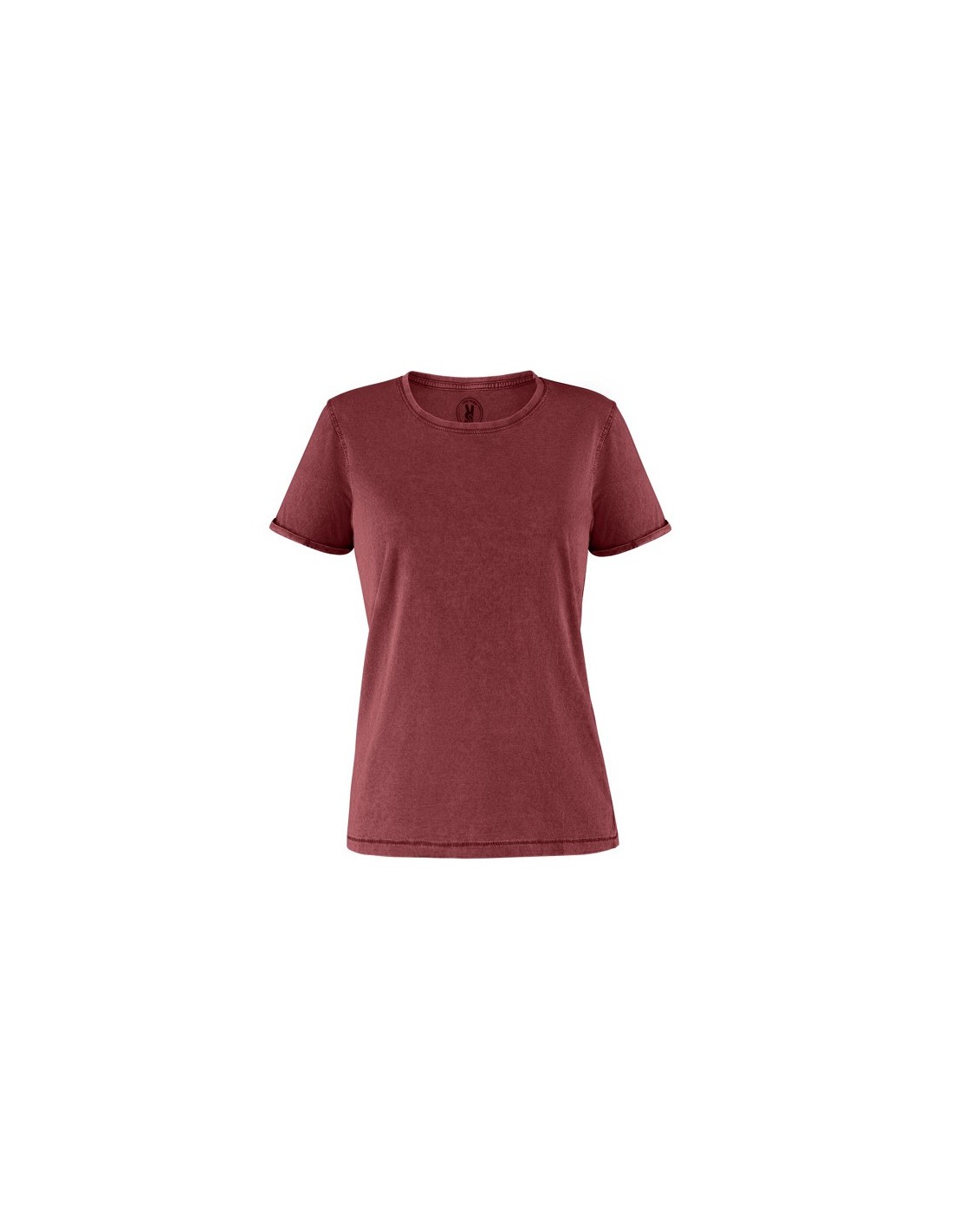 Camiseta de manga corta efecto jeans para mujer. Cuello fino redondo en canalé 1x1 con cubrecosturas de refuerzo de hombro a hombro. Doble costura en sisas. Apertura de manga con dobladillo.
