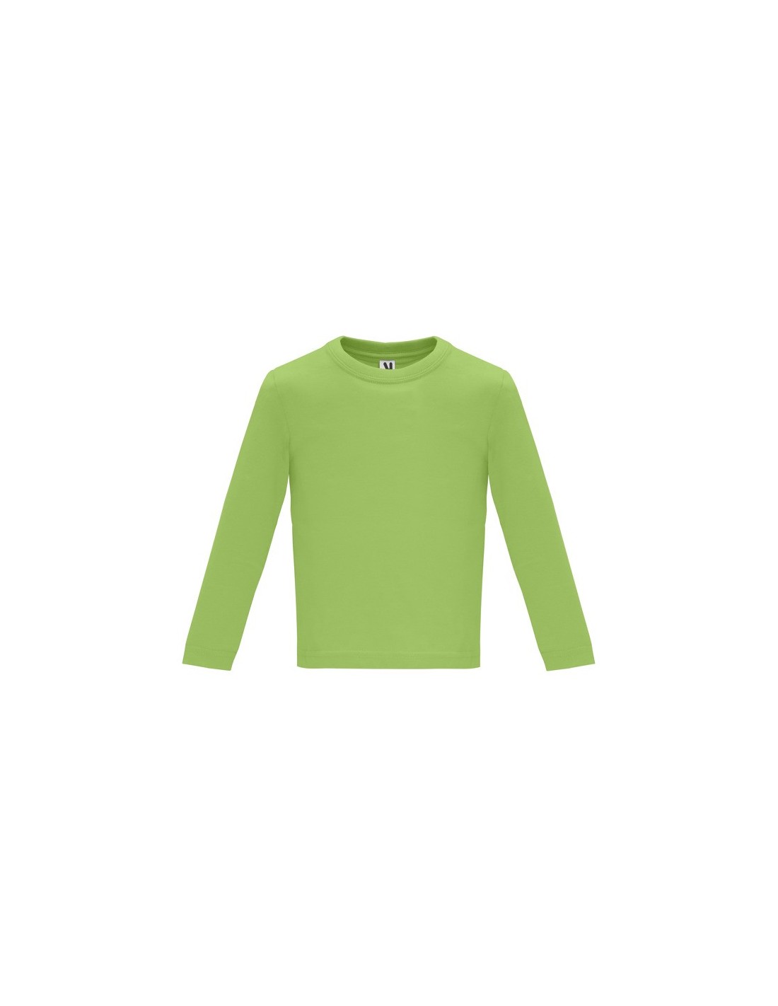 Camiseta de manga larga especial para bebé, confeccionada en tejido en galga fina y acabado compactado. Cuello redondo y apertura en hombro con corchetes desde la talla 6M a 18M. La talla 2A sin apertura en el hombro. Costuras laterales.