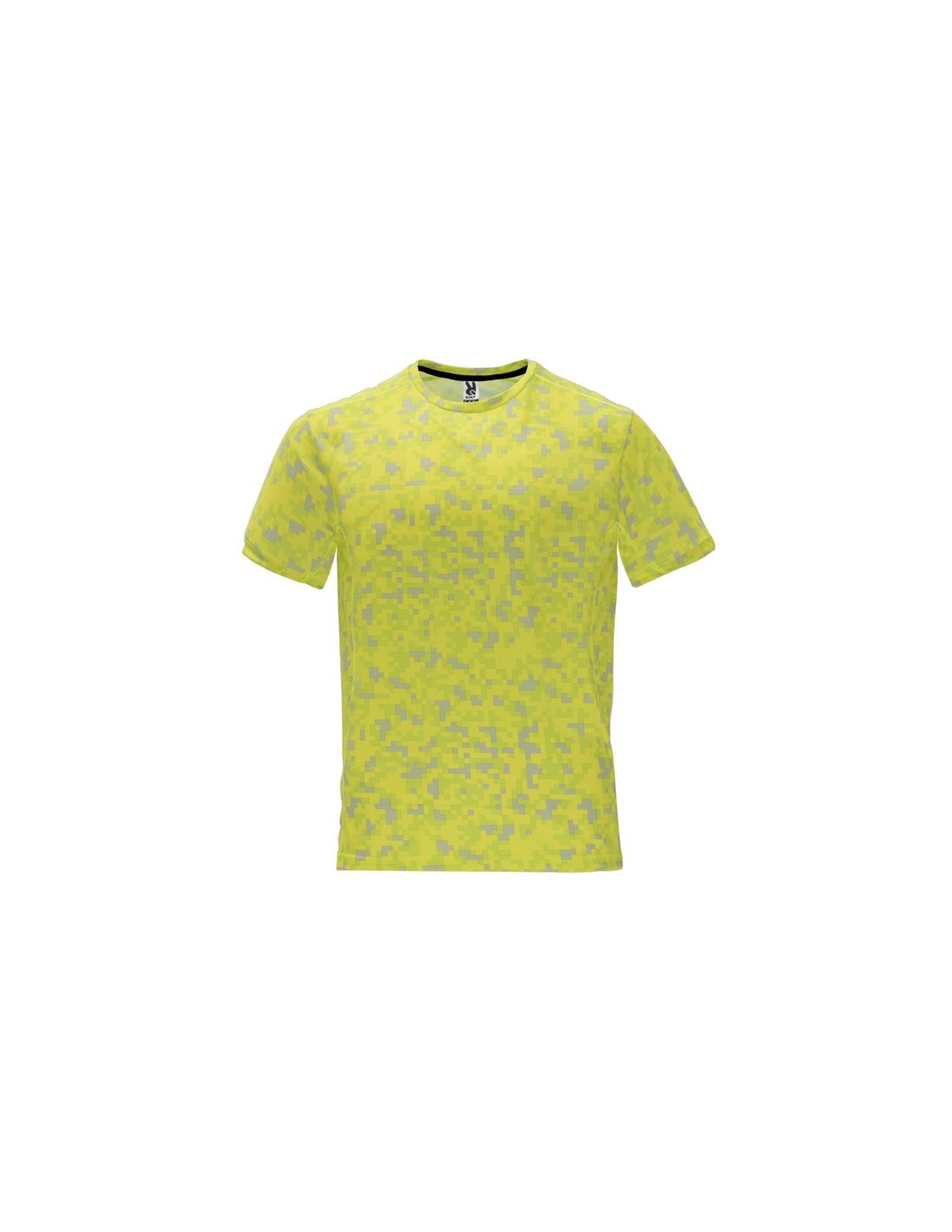 Camiseta técnica de manga corta estampada. Cuello redondo con cubre costuras de refuerzo a contraste en color amarillo flúor. Paneles laterales en interior de manga y en los hombros con remallado a tono. Tejido suave, ligero y transpirable, fácil secado.