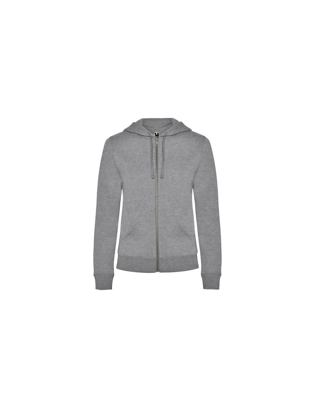 Sudadera de mujer con capucha forrada a tono. Cremallera metálica frontal y bolsillo estilo canguro. Cubrecosturas reforzado en el cuello interior, corte entallado, y punto canalé 2x2 en puños y cintura.
