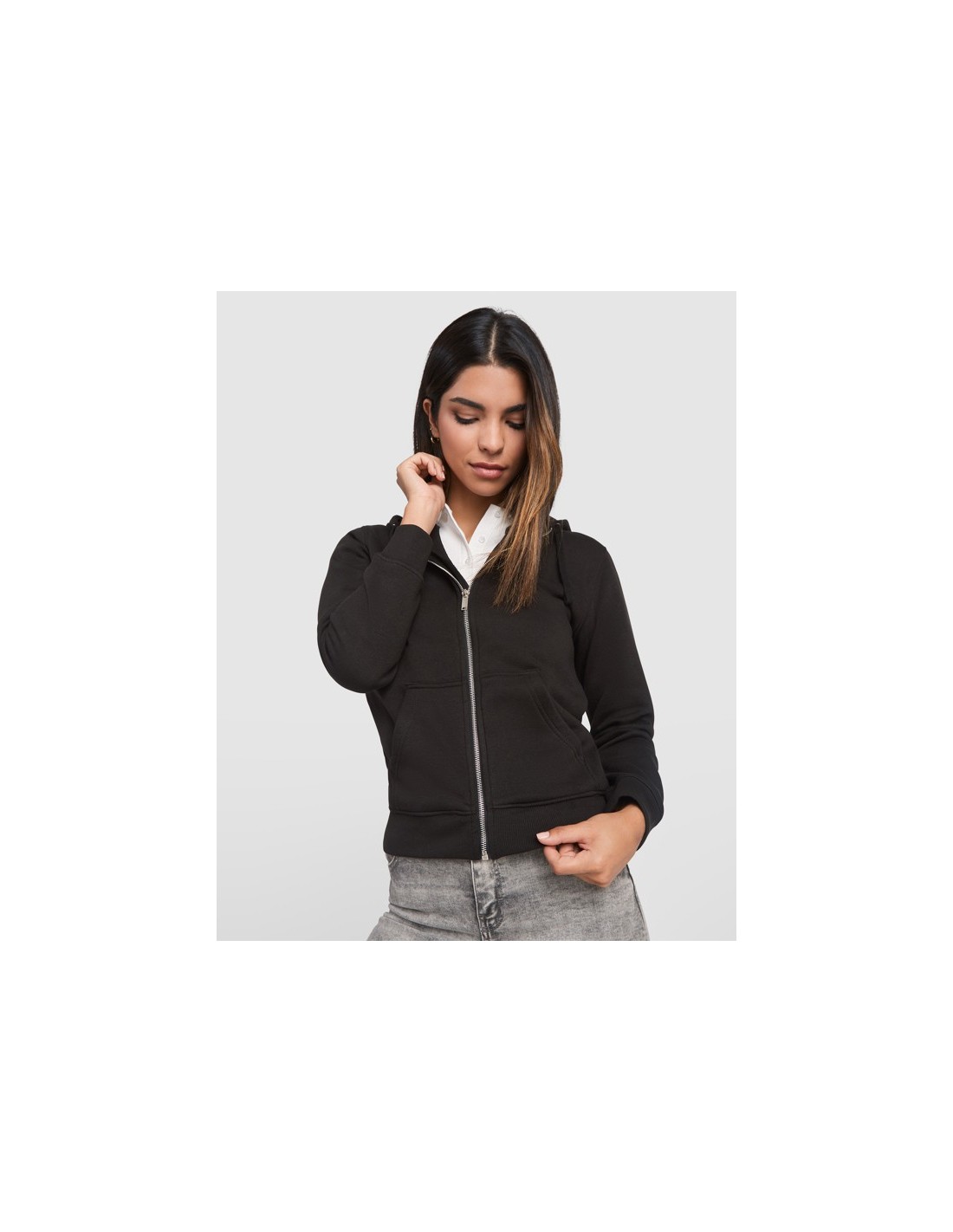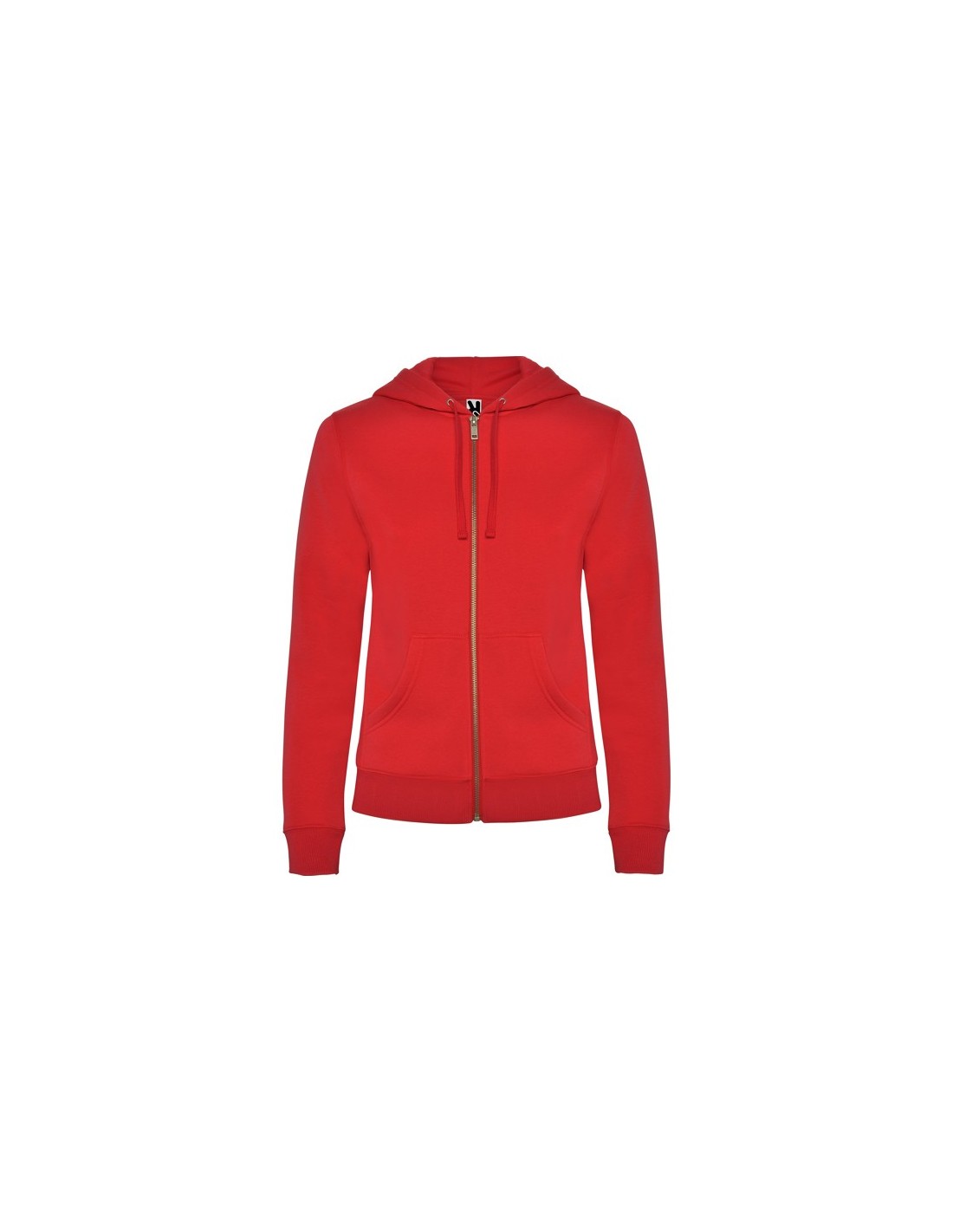 Sudadera de mujer con capucha forrada a tono. Cremallera metálica frontal y bolsillo estilo canguro. Cubrecosturas reforzado en el cuello interior, corte entallado, y punto canalé 2x2 en puños y cintura.