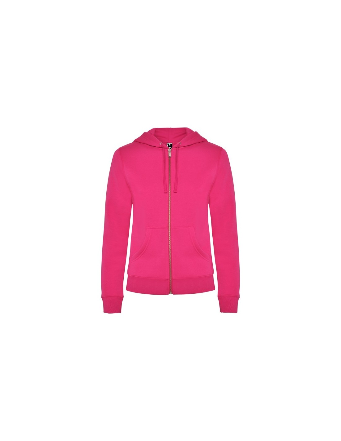Sudadera de mujer con capucha forrada a tono. Cremallera metálica frontal y bolsillo estilo canguro. Cubrecosturas reforzado en el cuello interior, corte entallado, y punto canalé 2x2 en puños y cintura.