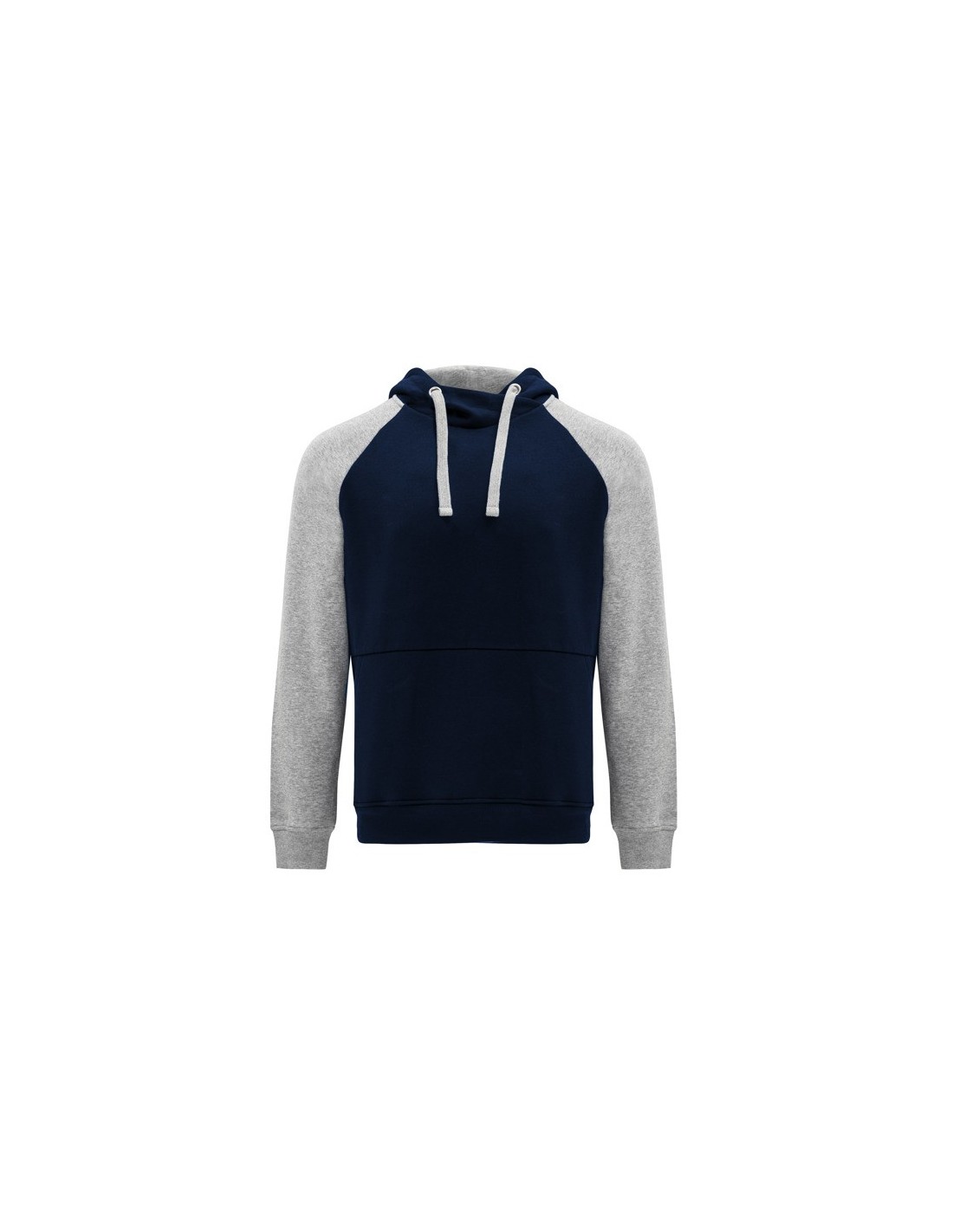 Sudadera bicolor unisex. Capucha con cuello cruzado y ojales metálicos, interior y cordones a contraste. Manga estilo ranglán a contraste. Bolsillo canguro. Puños y bajo con punto canalé con elastano 1x1.