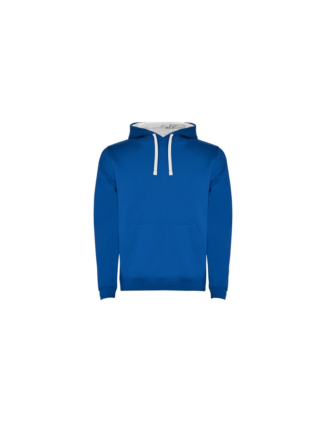 Sudadera con capucha de doble tejido, con cordón ajustable, en acabados solido y bicolor. Cubrecosturas en el cuello y bolsillo canguro. Punto canalé con elastano 1x1 en puños y cintura. Modelo de niño sin cordón.