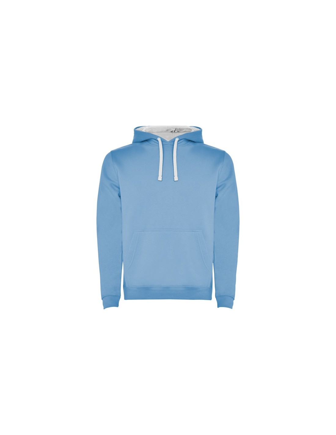Sudadera con capucha de doble tejido, con cordón ajustable, en acabados solido y bicolor. Cubrecosturas en el cuello y bolsillo canguro. Punto canalé con elastano 1x1 en puños y cintura. Modelo de niño sin cordón.