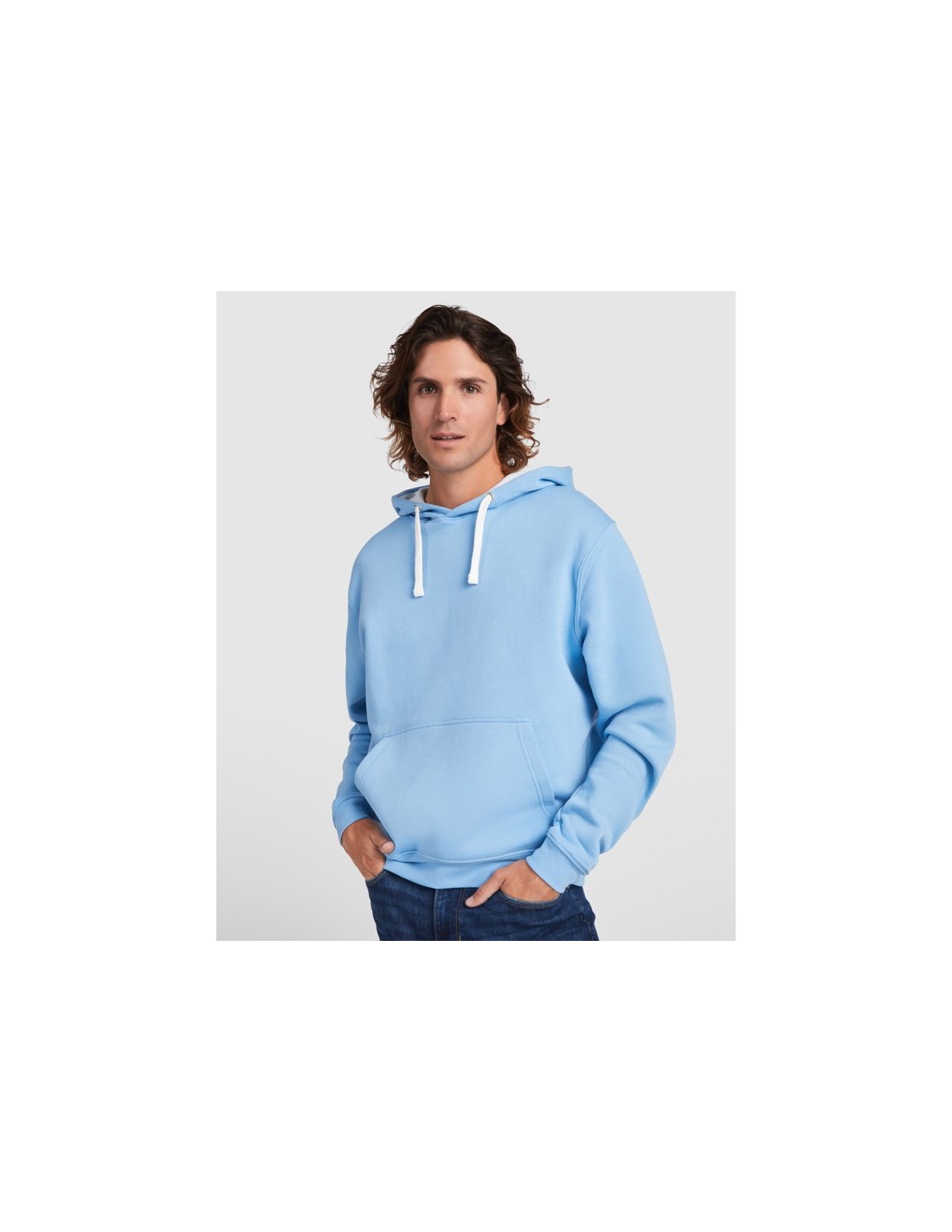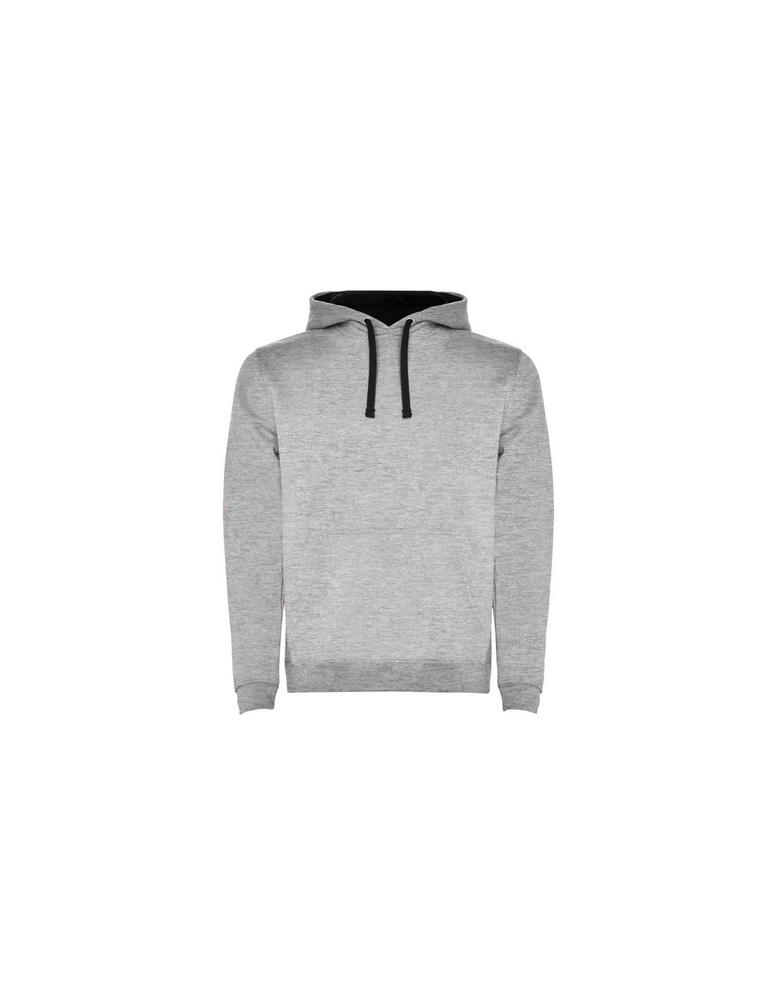 Sudadera con capucha de doble tejido, con cordón ajustable, en acabados solido y bicolor. Cubrecosturas en el cuello y bolsillo canguro. Punto canalé con elastano 1x1 en puños y cintura. Modelo de niño sin cordón.