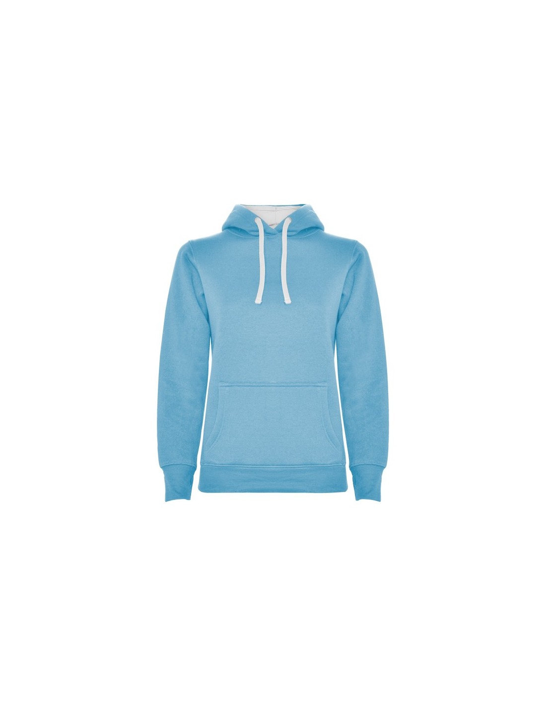 Sudadera entallada de corte femenino con capucha bicolor de doble tejido, con cordón contrastado ajustable, cubrecosturas en el cuello y bolsillo canguro. Punto canalé con elastano 1x1 en puños y cintura. Detalle thumb slit – puños con apertura para el pulgar.