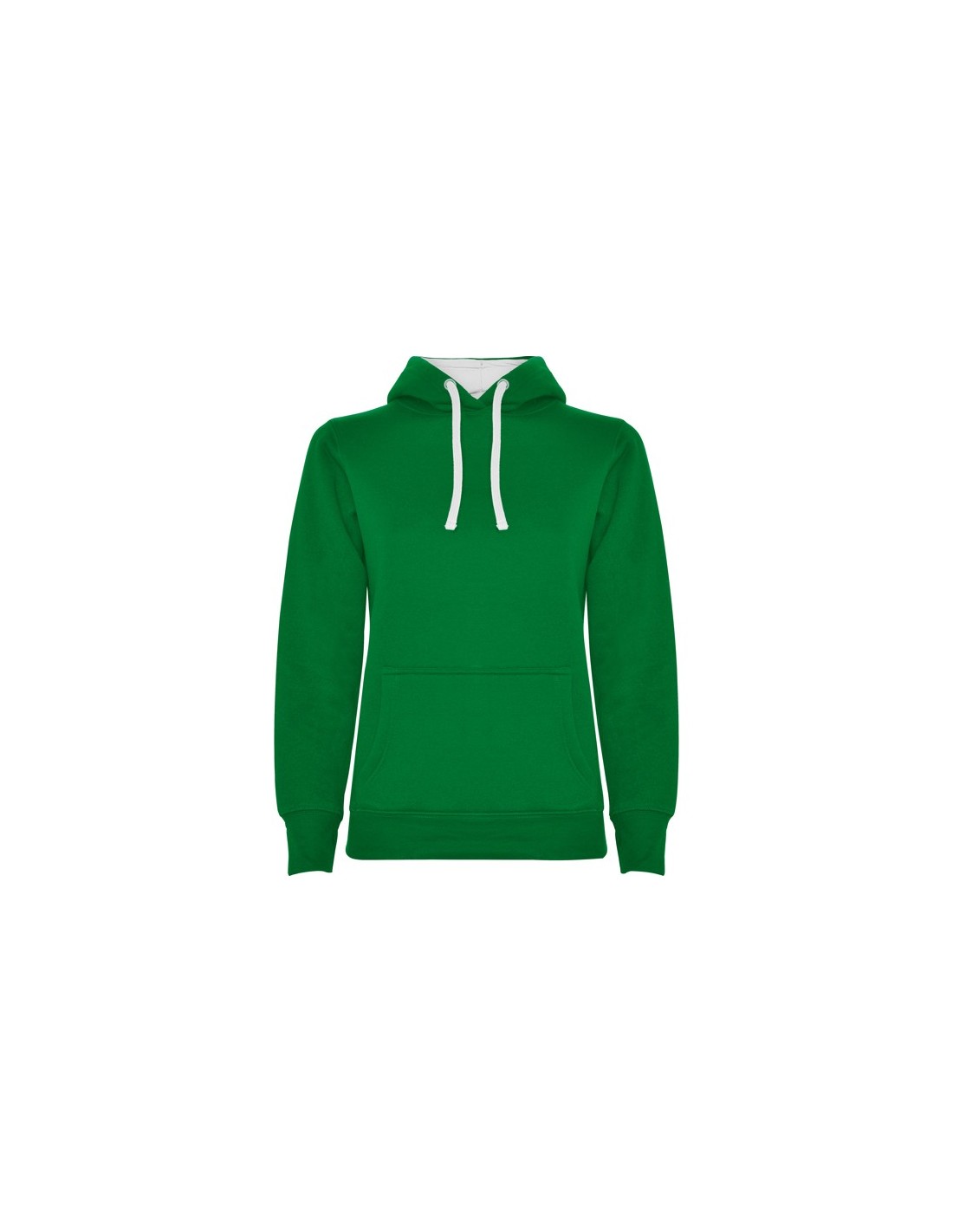 Sudadera entallada de corte femenino con capucha bicolor de doble tejido, con cordón contrastado ajustable, cubrecosturas en el cuello y bolsillo canguro. Punto canalé con elastano 1x1 en puños y cintura. Detalle thumb slit – puños con apertura para el pulgar.