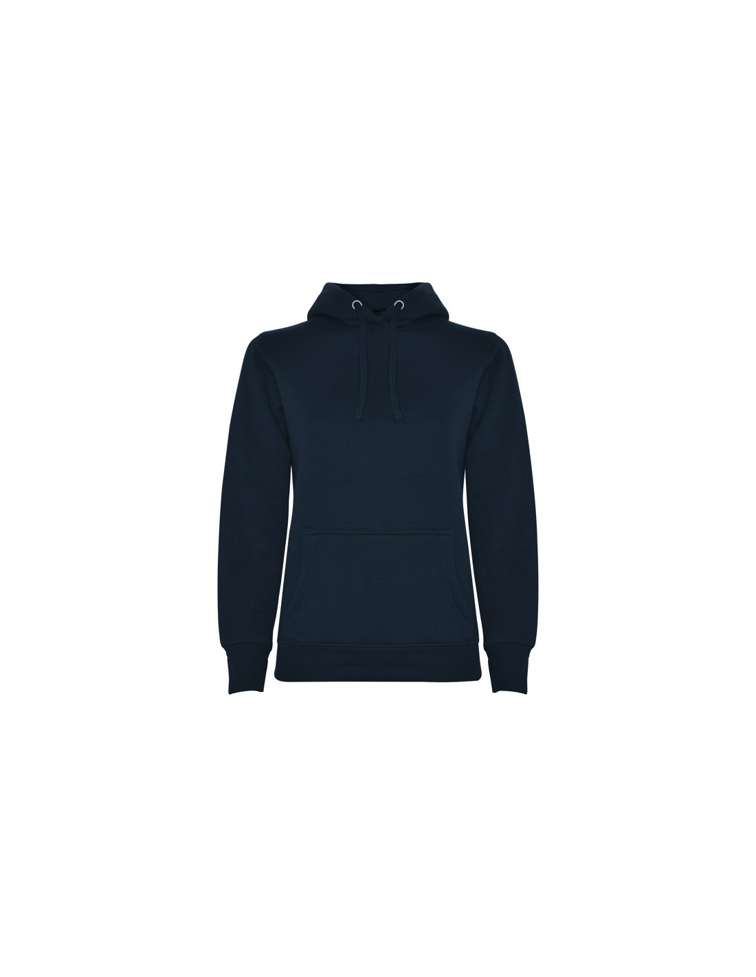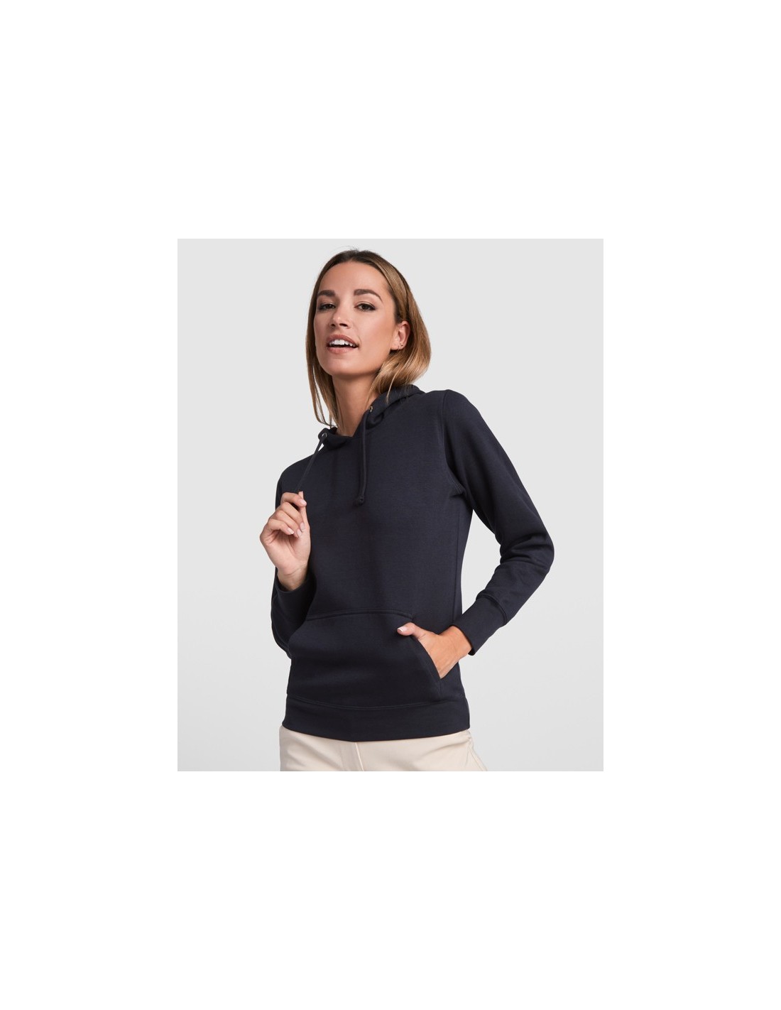 Sudadera entallada de corte femenino con capucha bicolor de doble tejido, con cordón contrastado ajustable, cubrecosturas en el cuello y bolsillo canguro. Punto canalé con elastano 1x1 en puños y cintura. Detalle thumb slit – puños con apertura para el pulgar.