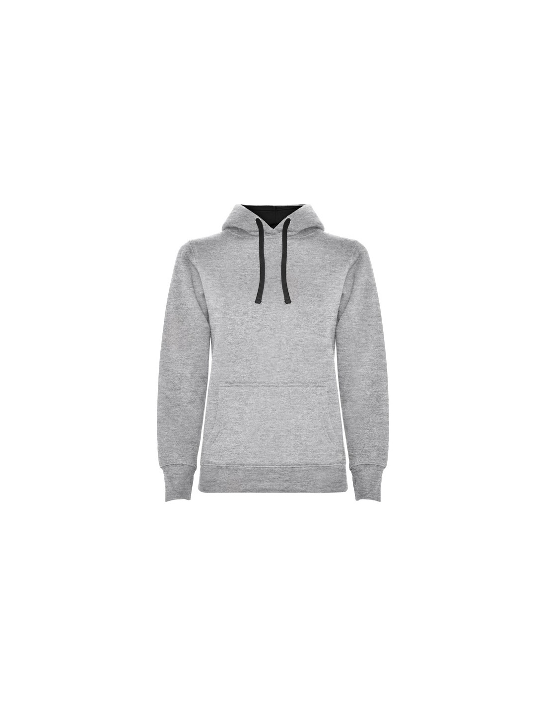 Sudadera entallada de corte femenino con capucha bicolor de doble tejido, con cordón contrastado ajustable, cubrecosturas en el cuello y bolsillo canguro. Punto canalé con elastano 1x1 en puños y cintura. Detalle thumb slit – puños con apertura para el pulgar.