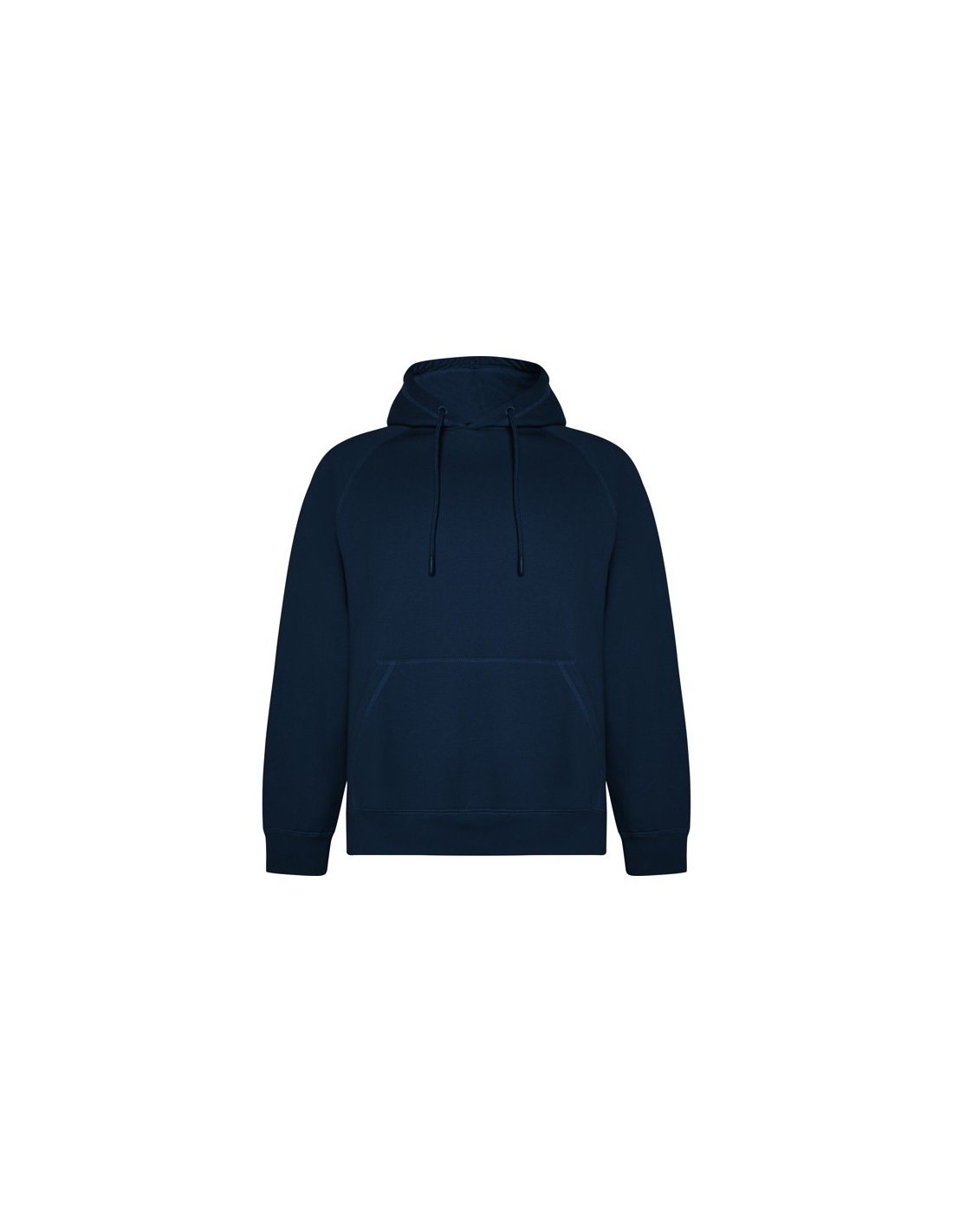 Sudadera con capucha Unisex en Algodón Orgánico Peinado y Poliéster Reciclado. Bolsillo Canguro. Capucha forrada de punto liso y cordones redondos ajustables , ojales bordados. cuello puños y cinturilla de punto canalé 2x1.