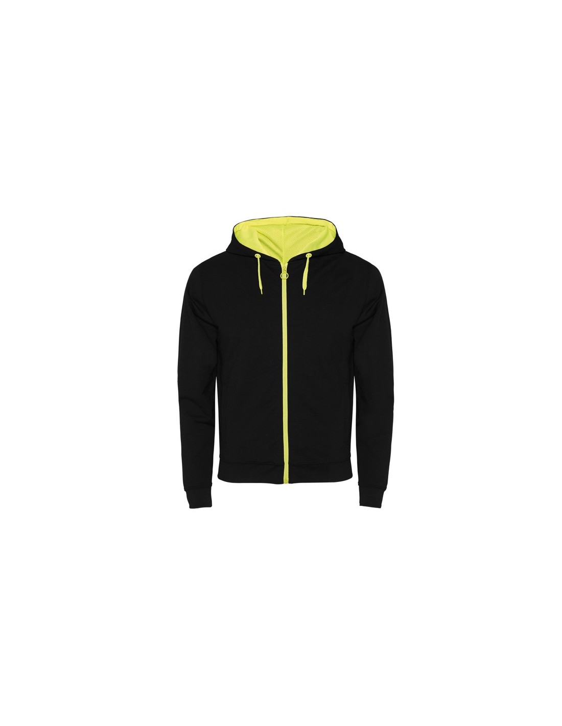 Sudadera de felpa no perchada con detalles en color flúor. Cremallera central con tirador en contraste color flúor. Capucha con forro interior en tejido de poliéster microperforado en contraste color flúor, con cordón y ojales metálicos en contraste color flúor. Manga larga con puño y cintura en punto canalé 1x1. Dos bolsillos frontales con vivo ancho. Cubrecosturas reforzado en el interior del cuello.