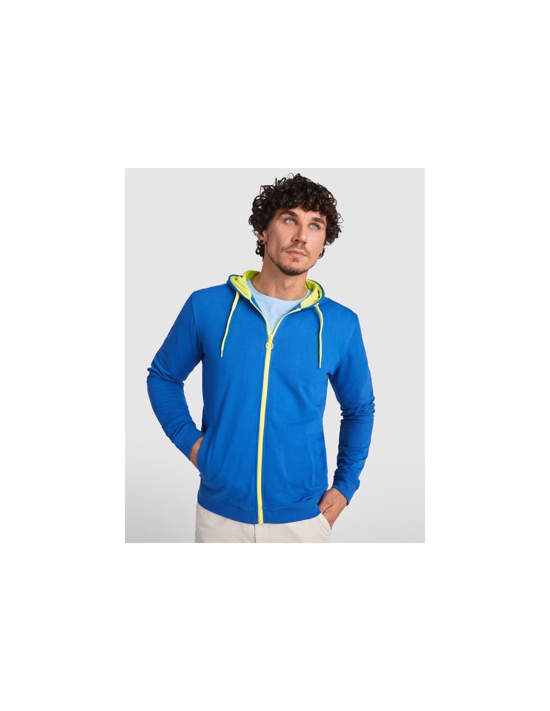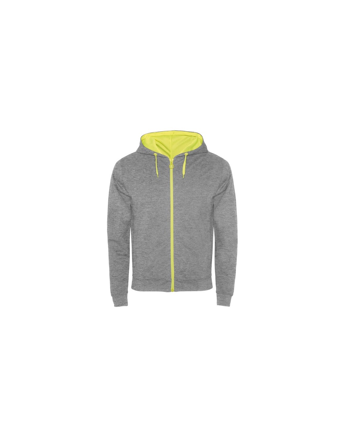 Sudadera de felpa no perchada con detalles en color flúor. Cremallera central con tirador en contraste color flúor. Capucha con forro interior en tejido de poliéster microperforado en contraste color flúor, con cordón y ojales metálicos en contraste color flúor. Manga larga con puño y cintura en punto canalé 1x1. Dos bolsillos frontales con vivo ancho. Cubrecosturas reforzado en el interior del cuello.