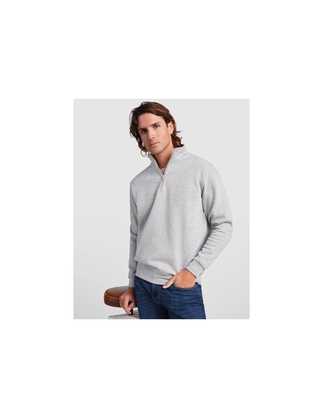 Sudadera con media cremallera a tono y cuello alto. Vista interior del cuello en el mismo tono. Cubrecosturas reforzado en el interior del cuello. Punto canalé 1x1 en puños y cintura.