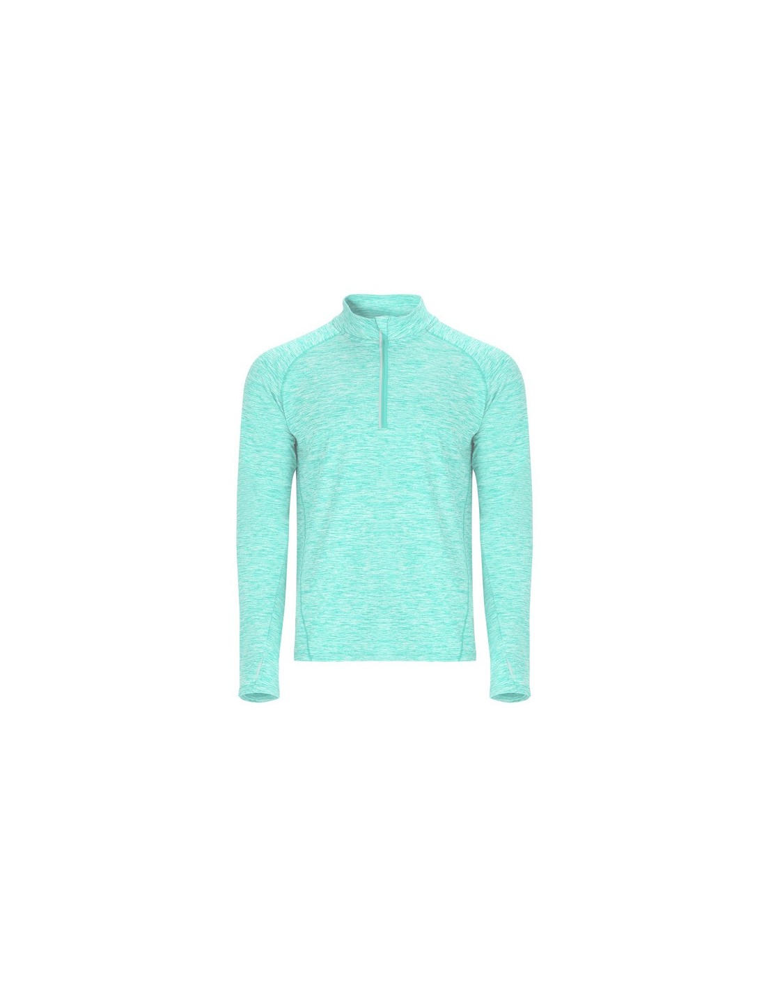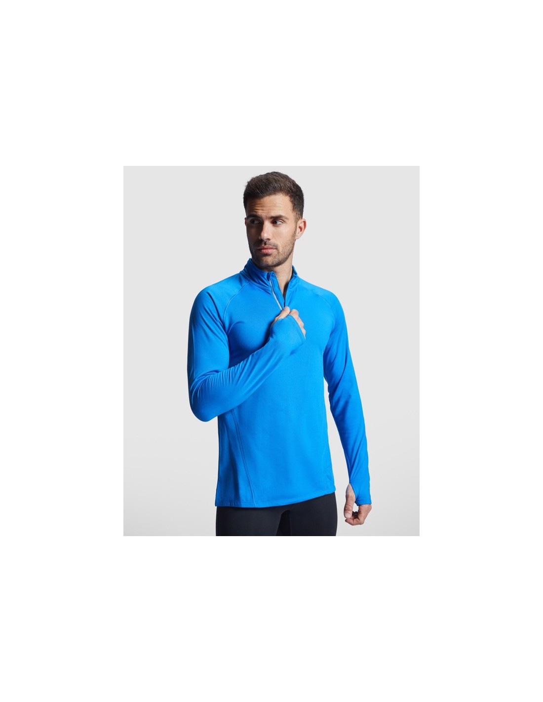 Sudadera técnica de manga larga ranglán para hombre con interior perchado. Cubrecosturas de refuerzo a contraste en el interior del cuello. Media cremallera invertida a tono con detalle reflectante. Puños con apertura para pulgar. El patronaje de la espalda es ligeramente más largo que el delantero. Detalles reflectantes en las espalda.