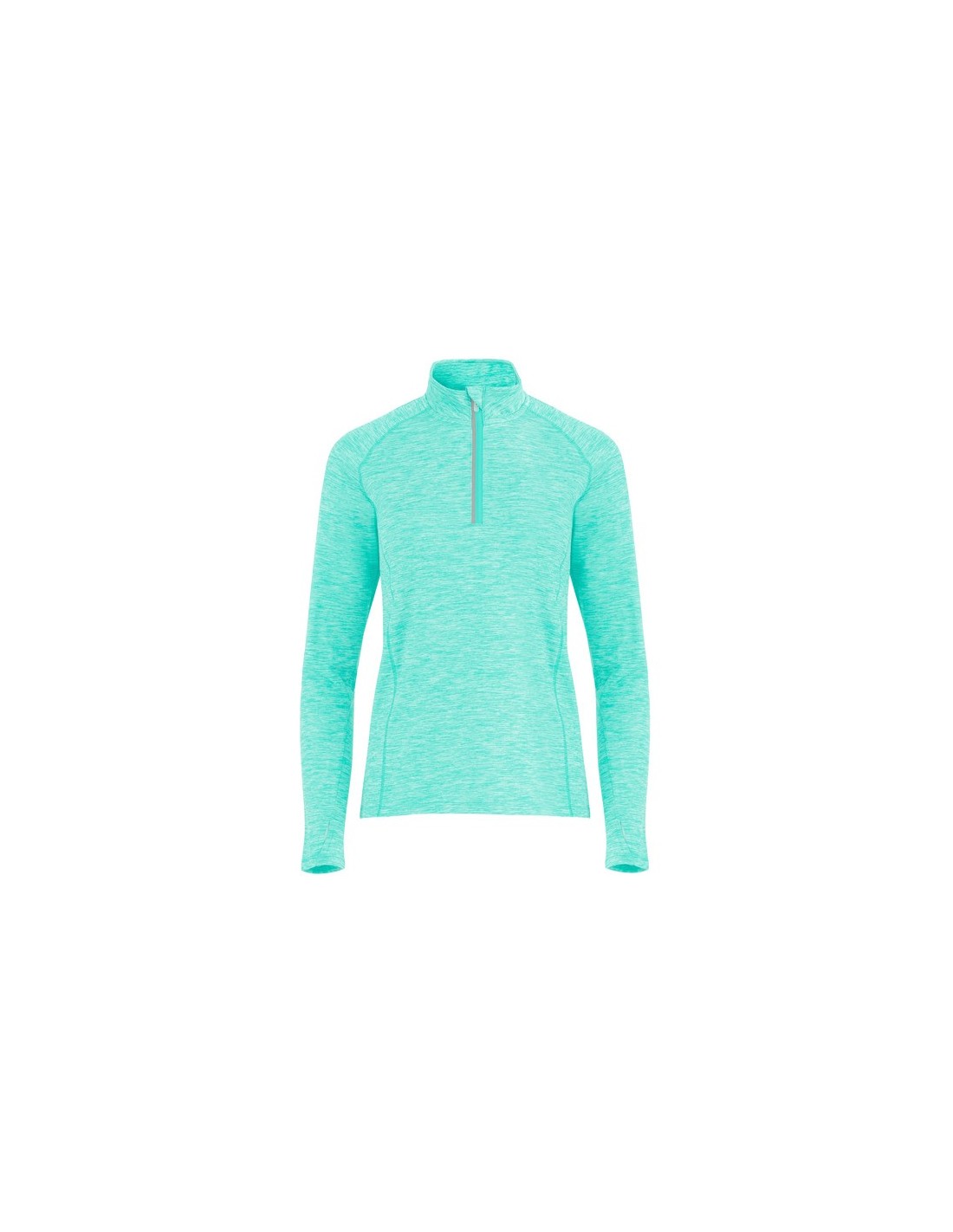 Sudadera técnica de manga larga ranglán para mujer con interior perchado. Cubrecosturas de refuerzo a contraste en el interior del cuello. Media cremallera invertida a tono con detalle reflectante. Puños con apertura para pulgar. El patronaje de la espalda es ligeramente más largo que el delantero. Detalles reflectantes en las espalda.