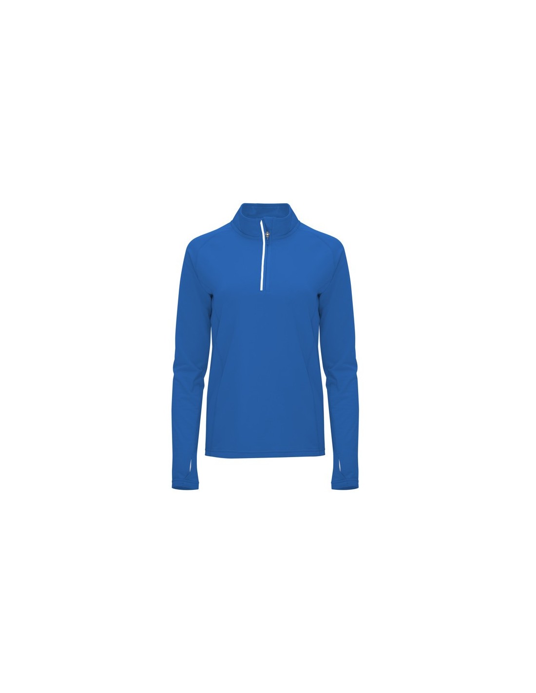 Sudadera técnica de manga larga ranglán para mujer con interior perchado. Cubrecosturas de refuerzo a contraste en el interior del cuello. Media cremallera invertida a tono con detalle reflectante. Puños con apertura para pulgar. El patronaje de la espalda es ligeramente más largo que el delantero. Detalles reflectantes en las espalda.