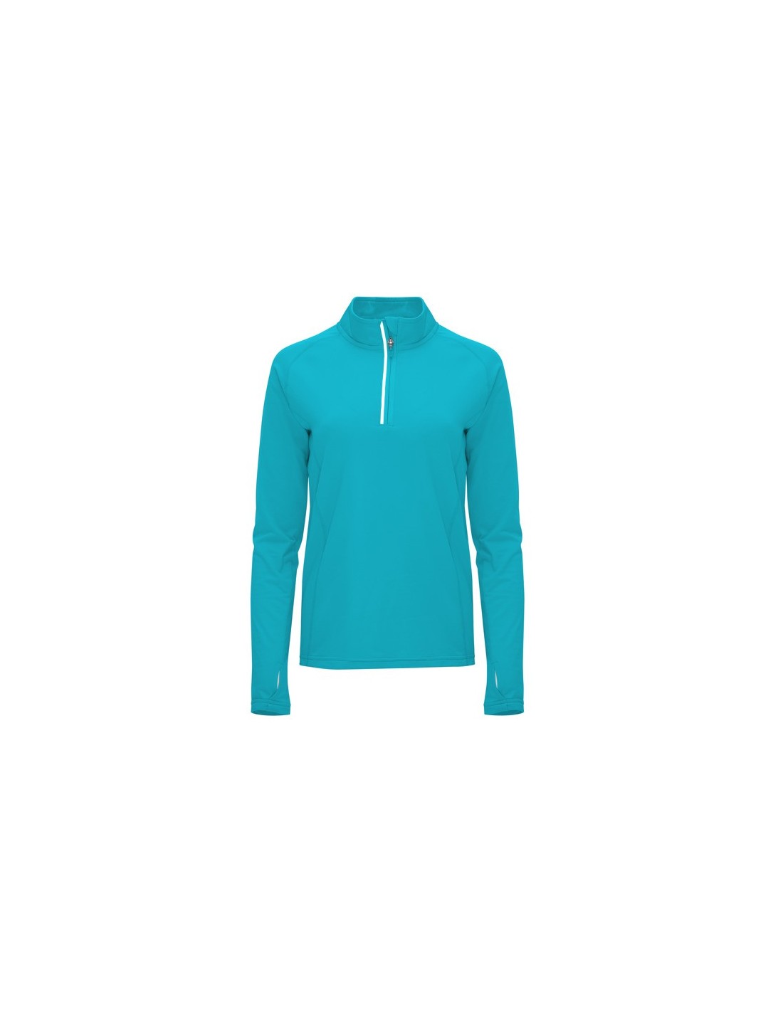 Sudadera técnica de manga larga ranglán para mujer con interior perchado. Cubrecosturas de refuerzo a contraste en el interior del cuello. Media cremallera invertida a tono con detalle reflectante. Puños con apertura para pulgar. El patronaje de la espalda es ligeramente más largo que el delantero. Detalles reflectantes en las espalda.