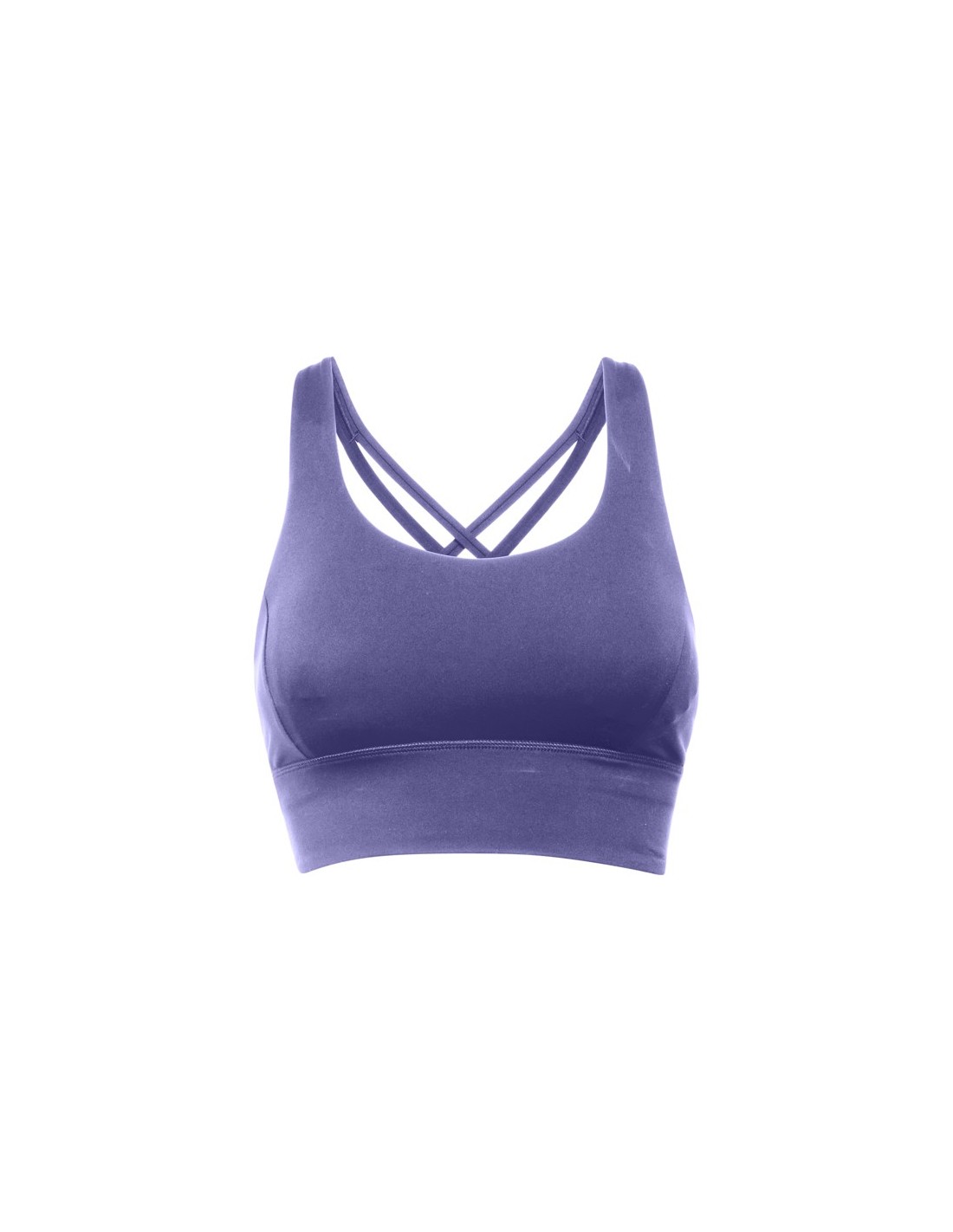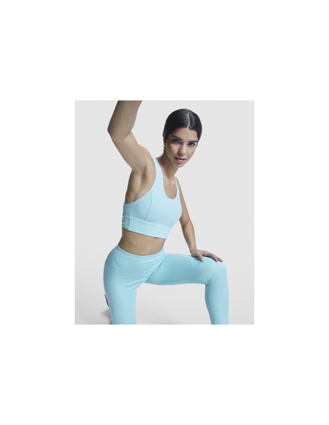 Top deportivo para mujer de alta sujeción. Tirantes entrelazados en espalda. Banda elástica de refuerzo en pieza bajo pecho. Doble tejido y forro. Copas de foam extraíbles. Logo Roly reflectante en la espalda.