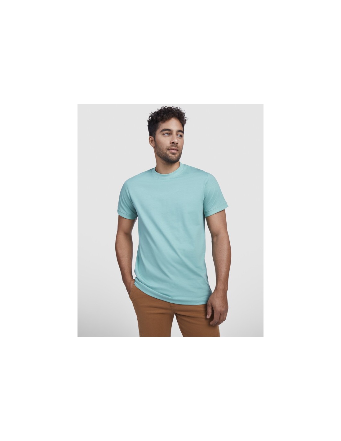 Camiseta gruesa de hombre en manga corta de algodón . Cuello redondo y ribete mangas en canalé ancho 2x1. Cubrecosturas reforzado en cuello. Costuras laterales. Logo Roly a tono en bajo lateral izquierdo. Costura ancha en el bajo.