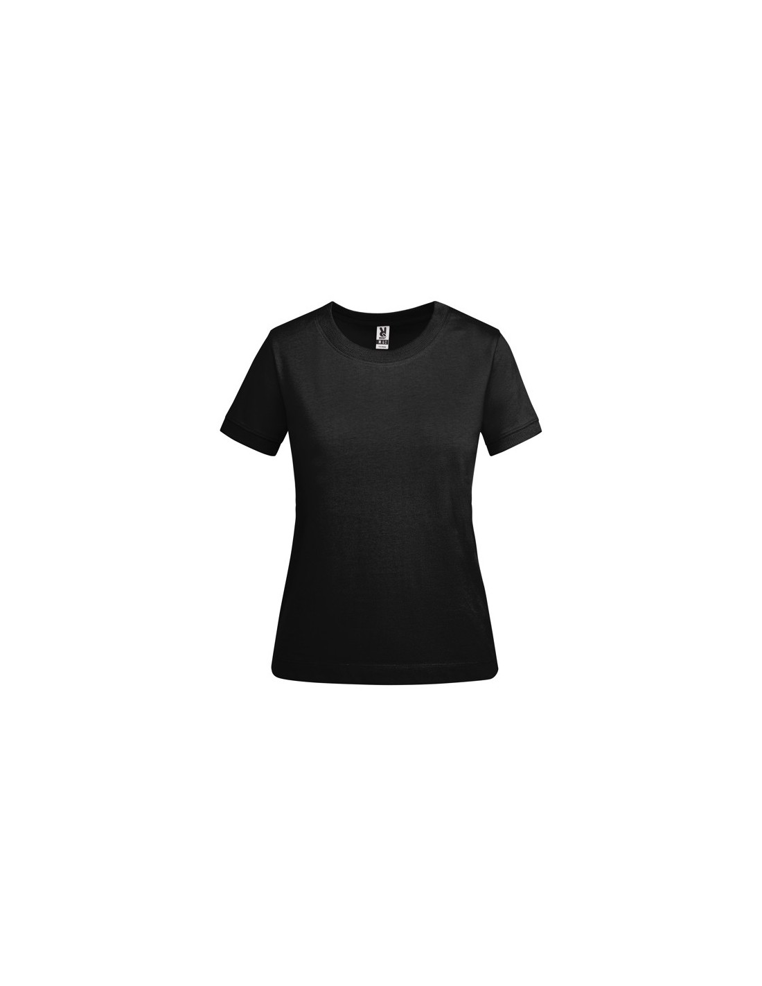 Camiseta gruesa de mujer en manga corta de algodón. Cuello redondo y ribete mangas en canalé ancho 2x1. Cubrecosturas reforzado en cuello. Costuras laterales. Logo Roly a tono en bajo lateral izquierdo. Costura ancha en el bajo.