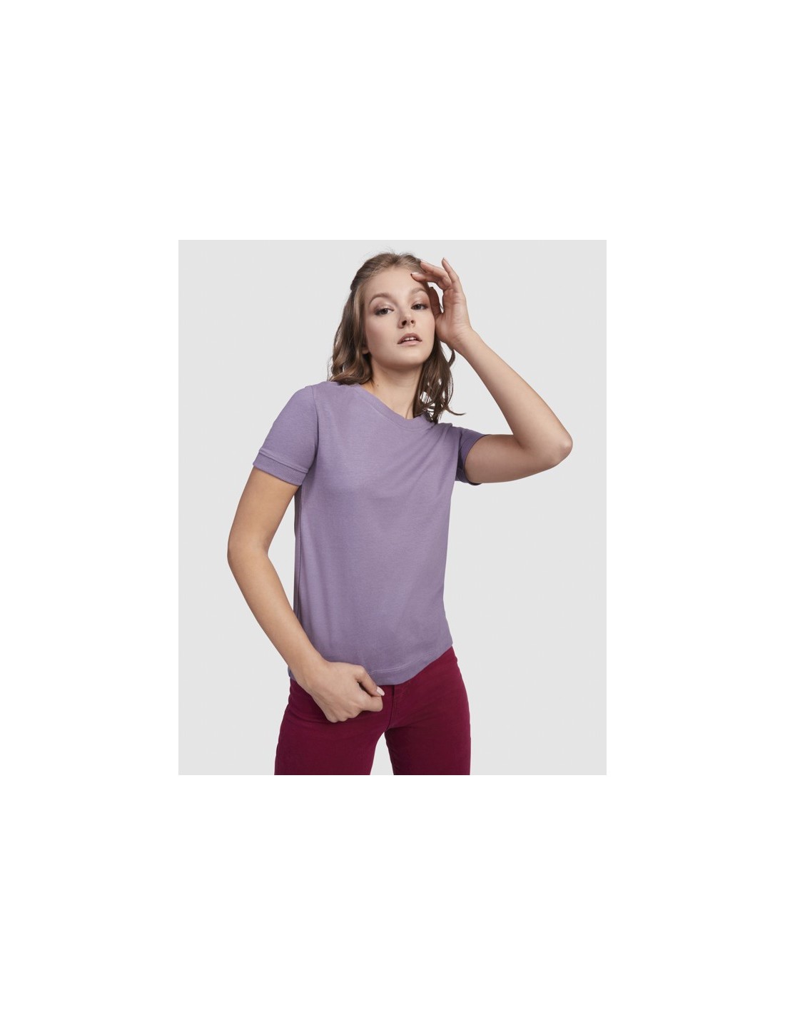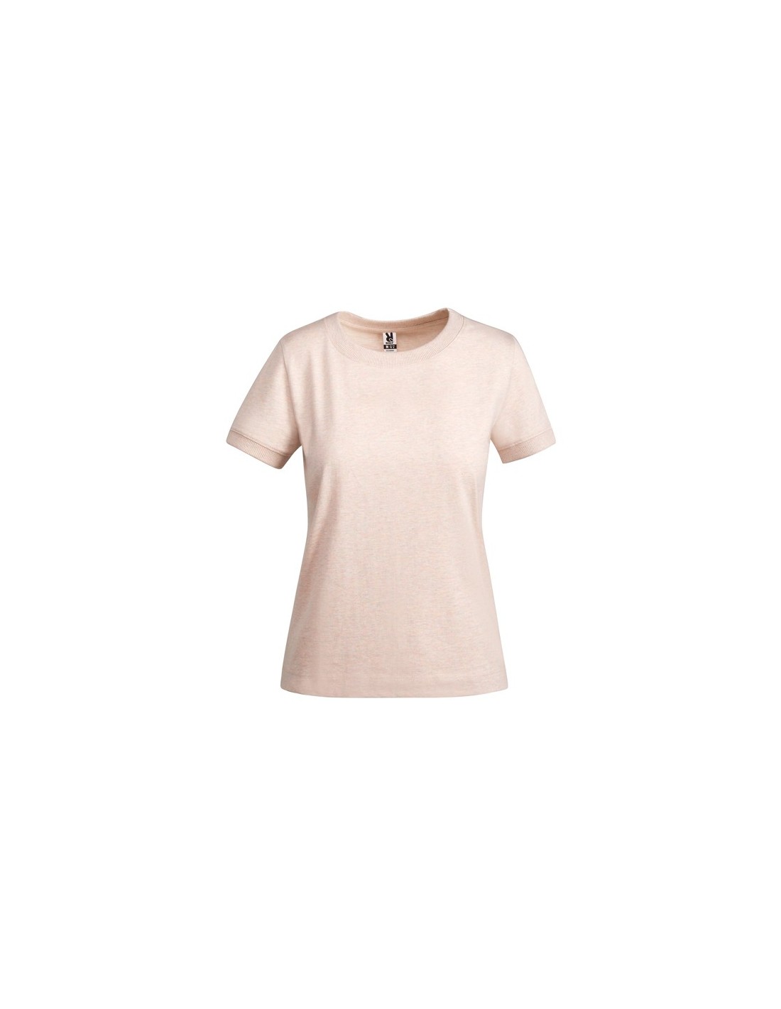 Camiseta gruesa de mujer en manga corta de algodón. Cuello redondo y ribete mangas en canalé ancho 2x1. Cubrecosturas reforzado en cuello. Costuras laterales. Logo Roly a tono en bajo lateral izquierdo. Costura ancha en el bajo.