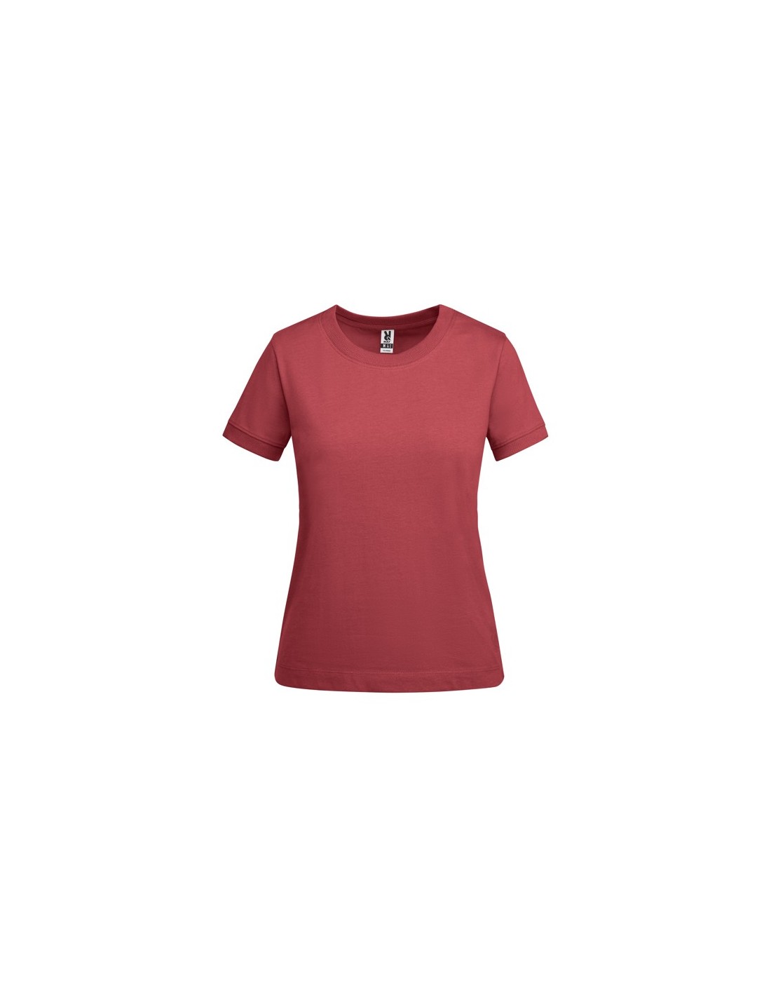 Camiseta gruesa de mujer en manga corta de algodón. Cuello redondo y ribete mangas en canalé ancho 2x1. Cubrecosturas reforzado en cuello. Costuras laterales. Logo Roly a tono en bajo lateral izquierdo. Costura ancha en el bajo.