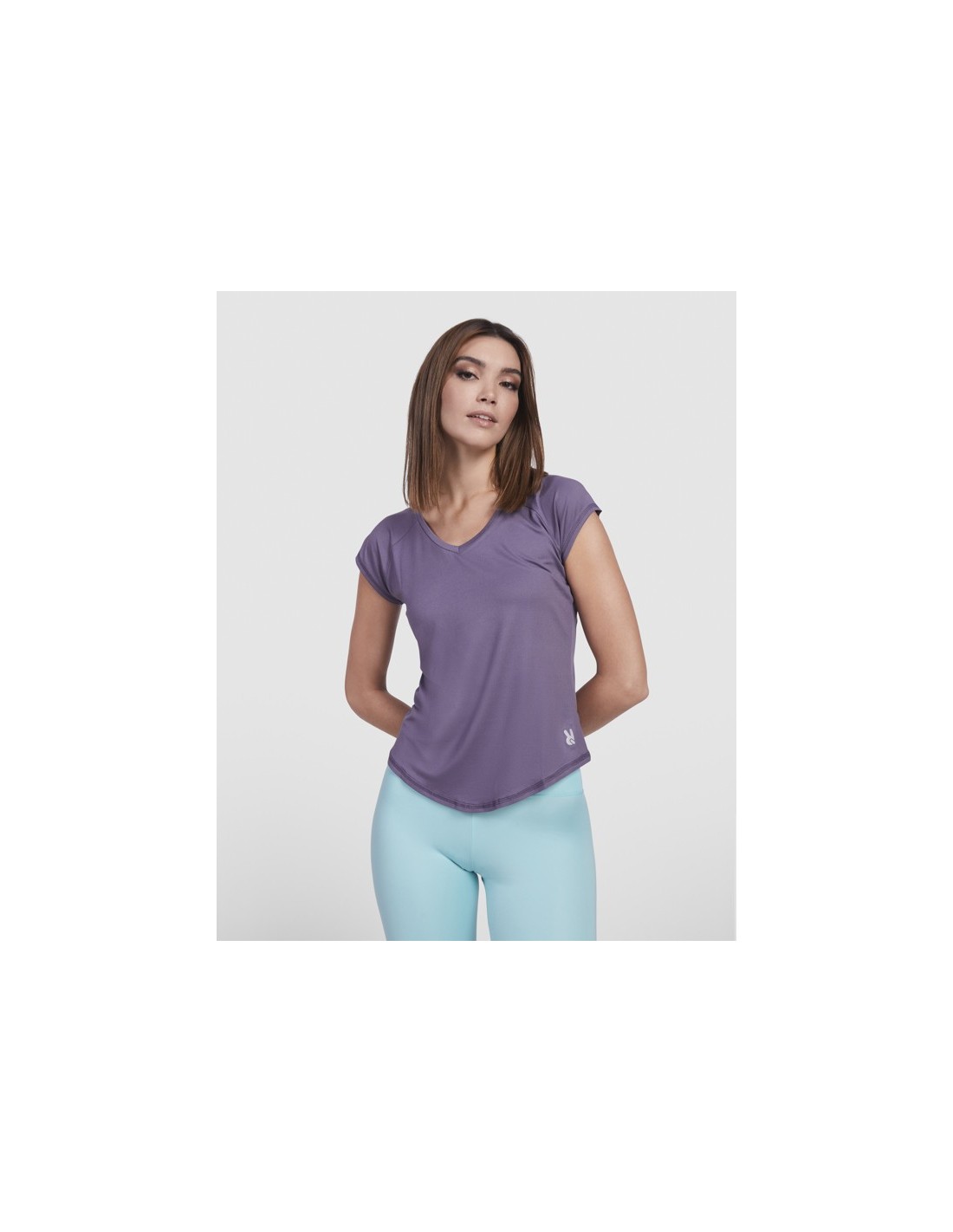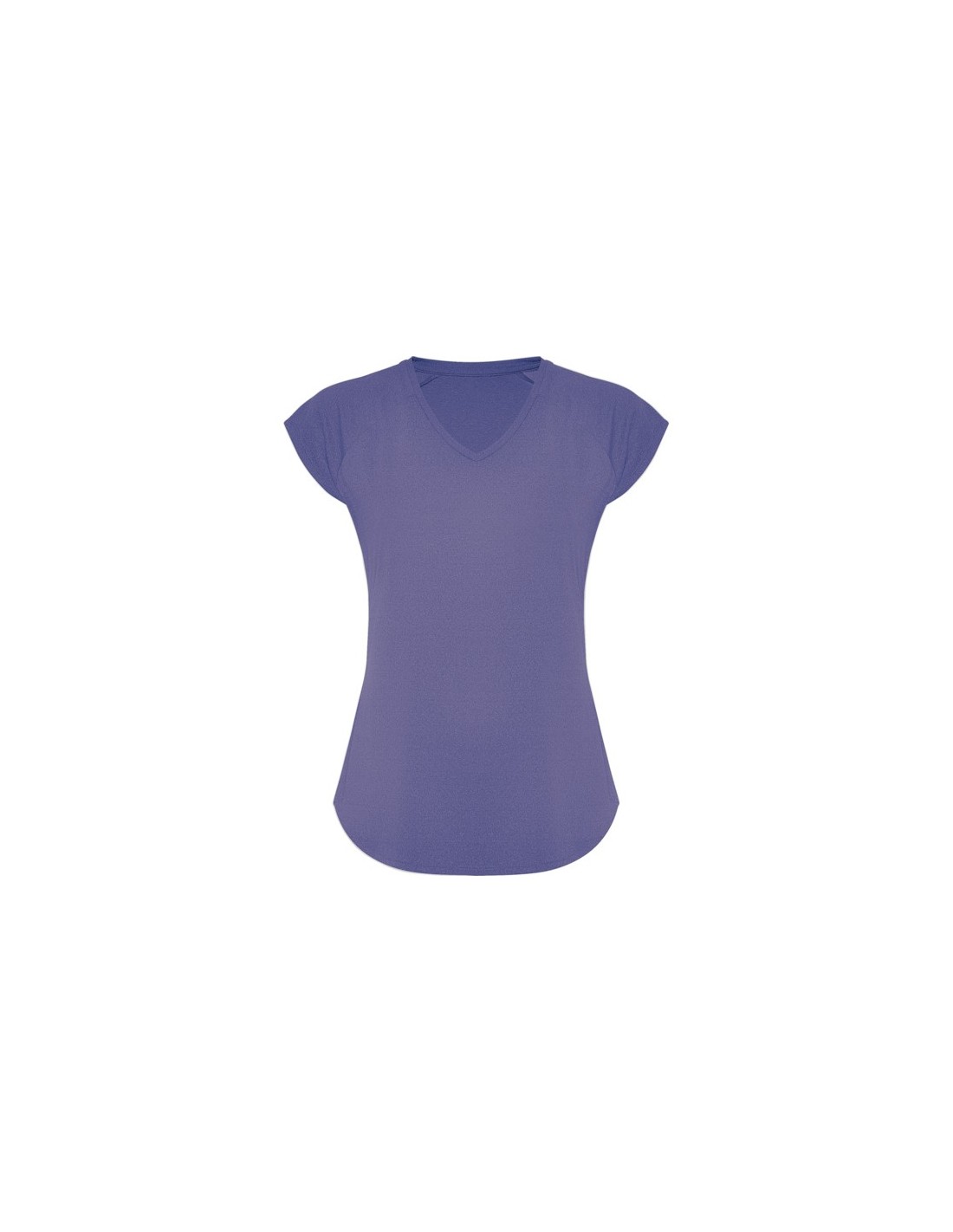 Camiseta técnica multideporte para mujer con manga ranglán. Cuello pico. Tejido poliéster con tacto algodón. Corte entallado. Bajo con forma curva. Costuras overlock a tono en bajo y mangas. Logo Roly reflectante en bajo lateral izquierdo.